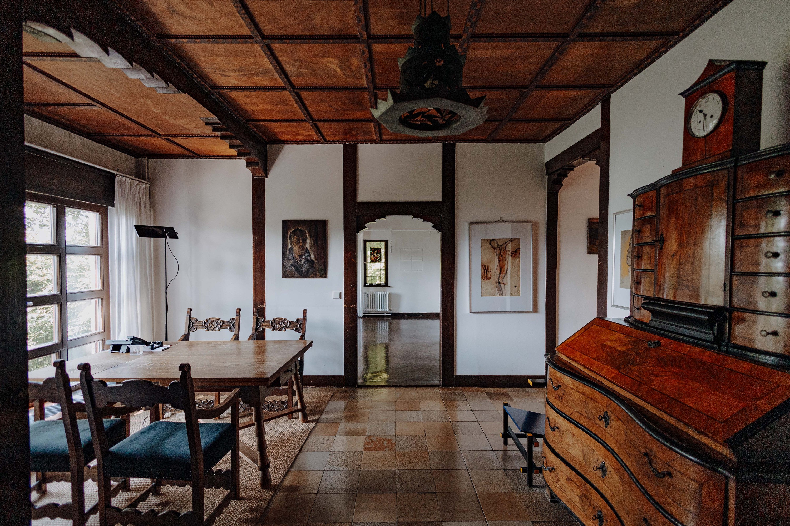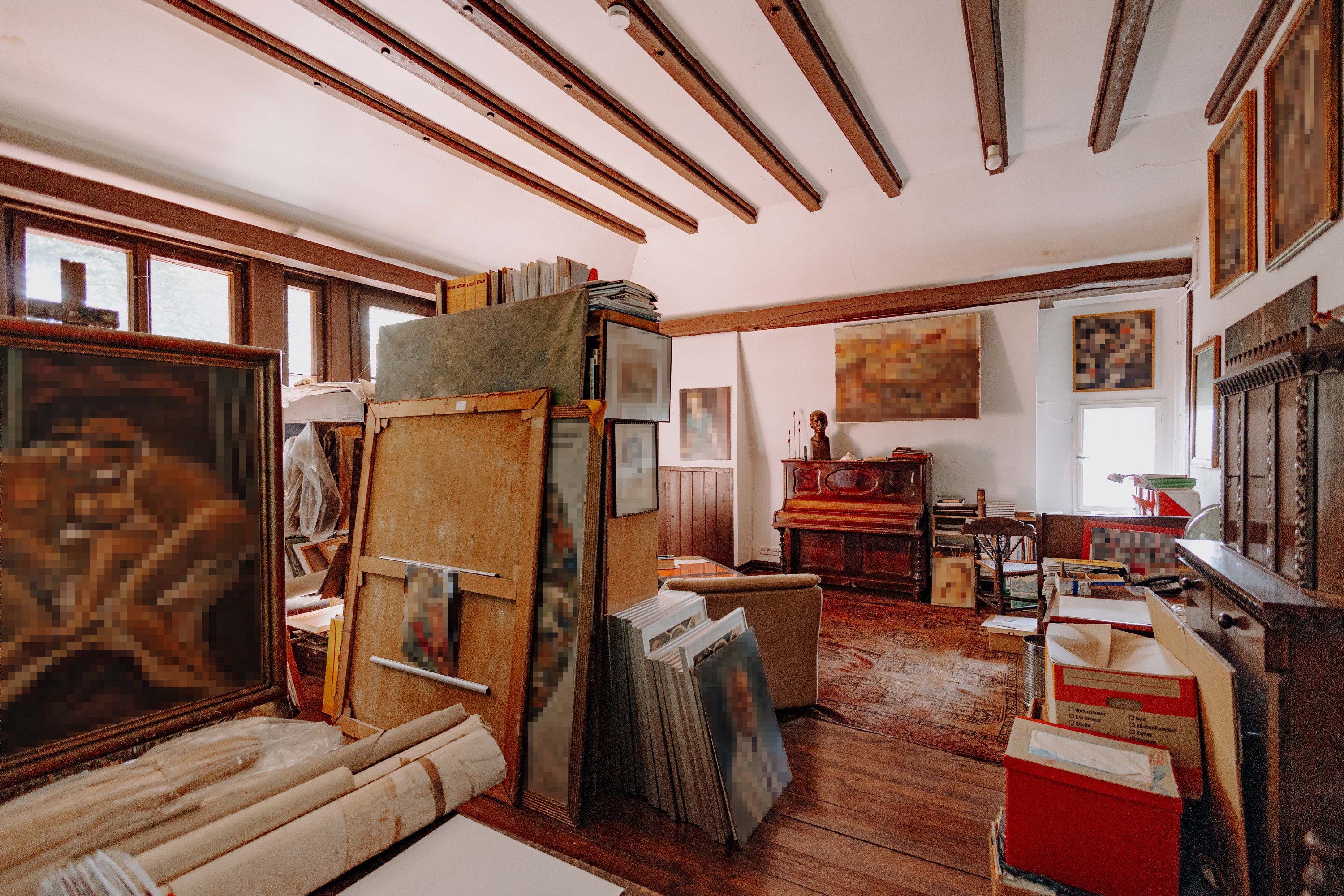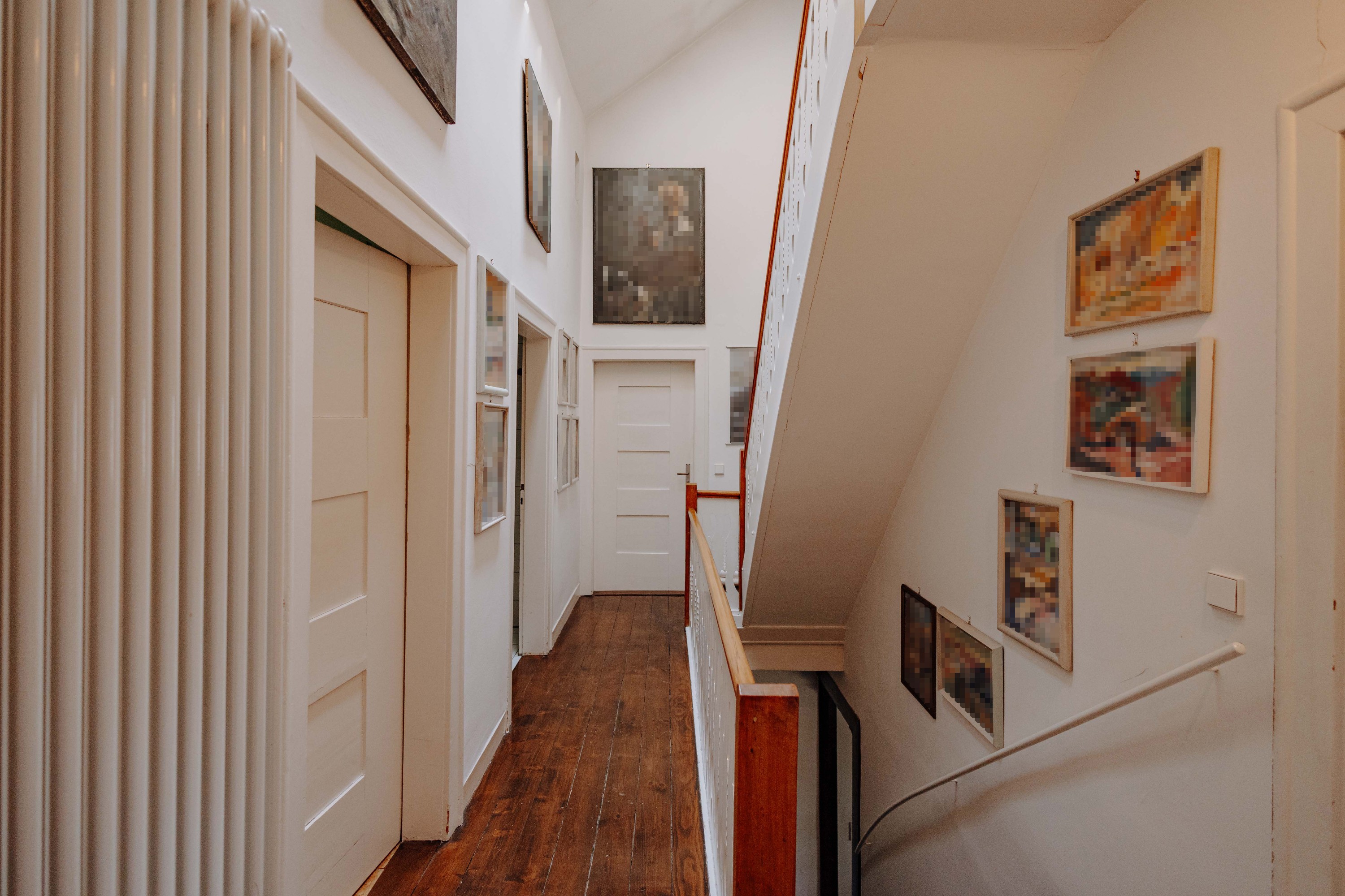 Das Obergeschoss beherbergt die Hauptschlafräume mit weitem Ausblick, ein Gästezimmer sowie ein Arbeitszimmer. Ein Ankleidezimmer und das modernisierte Bad mit Wanne, Dusche und zwei Waschbecken runden die Etage ab. Besondere Beachtung verdient das lichtdurchflutete Atelier am Ende des Flurs. Das Dachgeschoss bietet ein weiteres Zimmer zur freien Nutzung sowie zwei Bühnenräume.