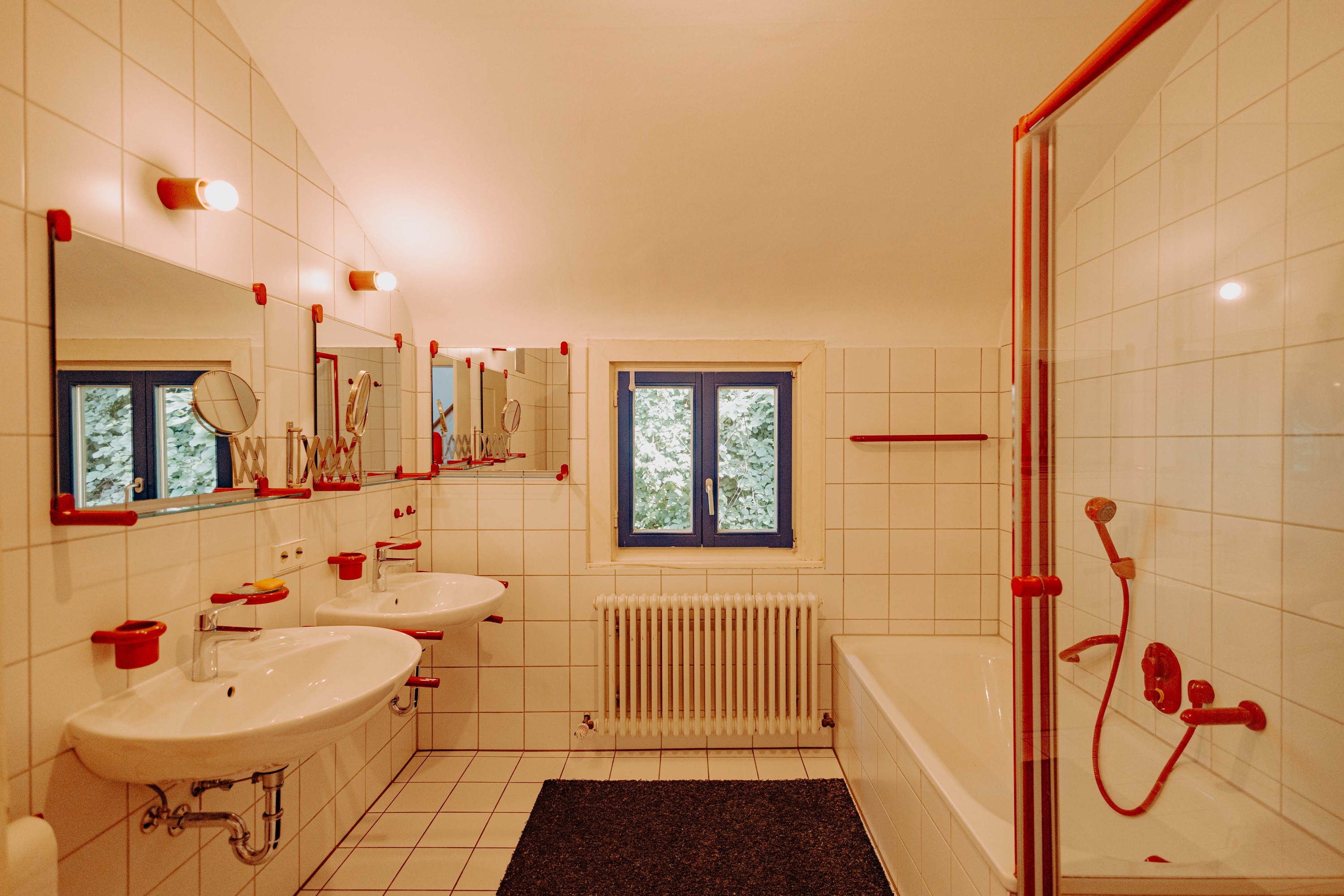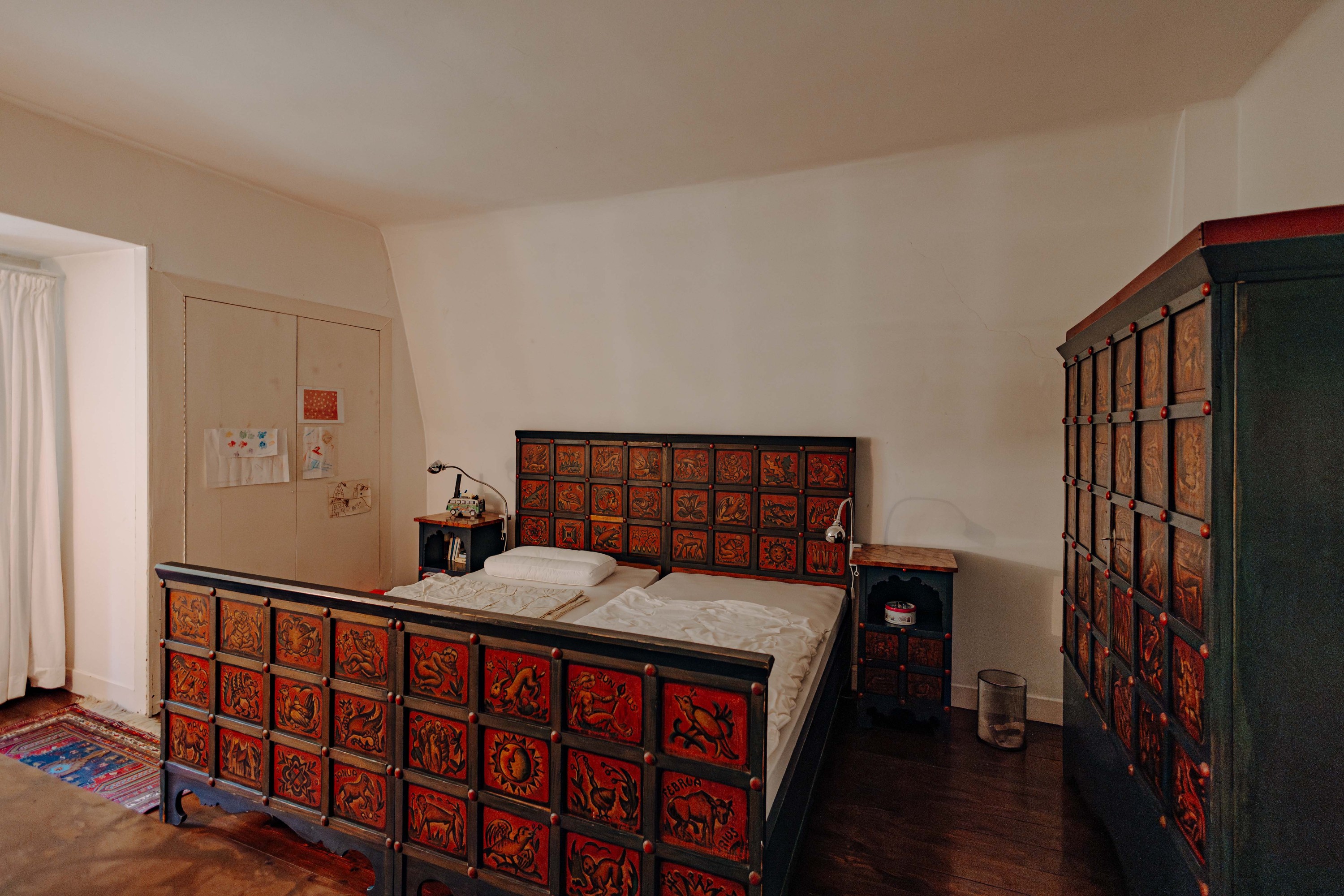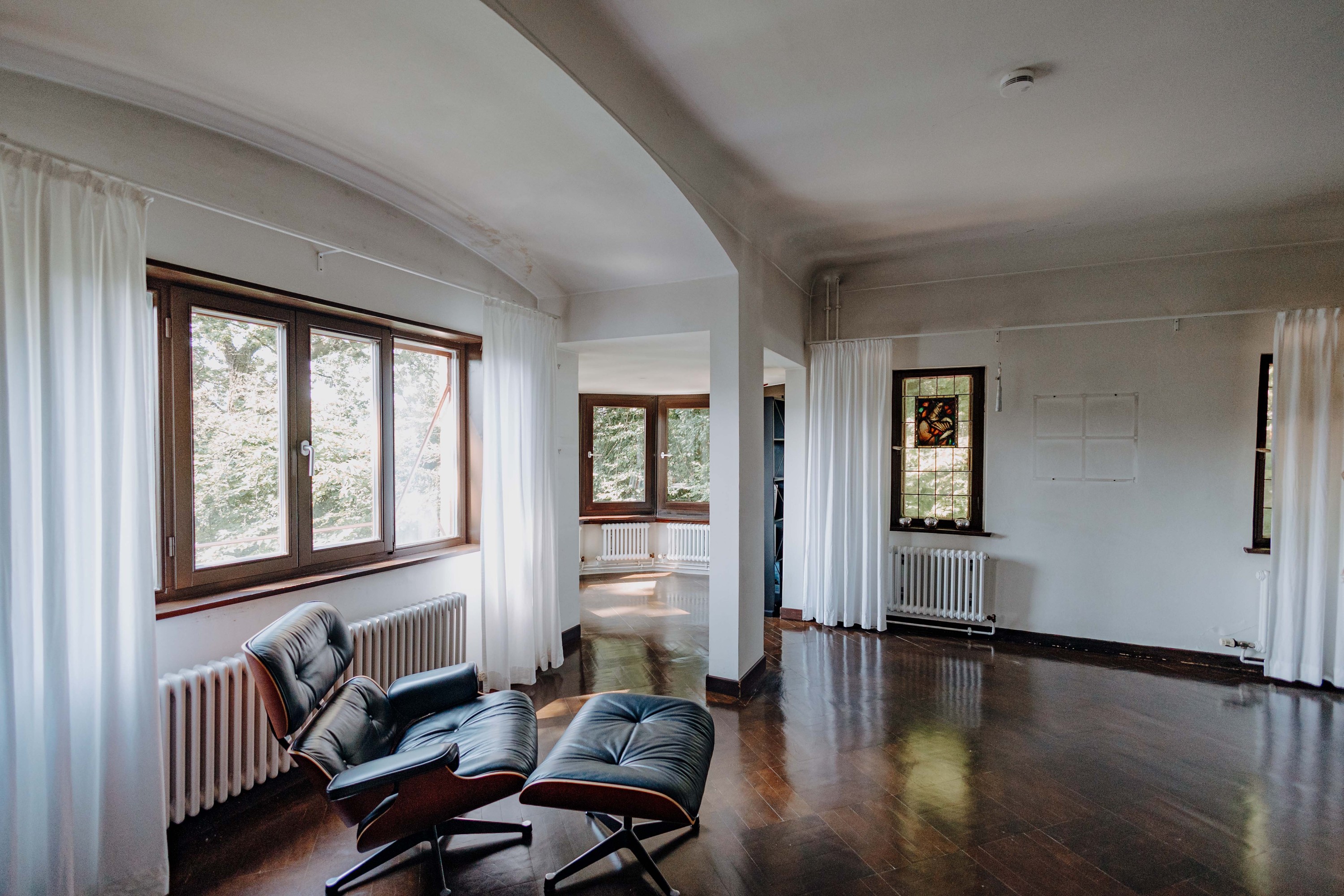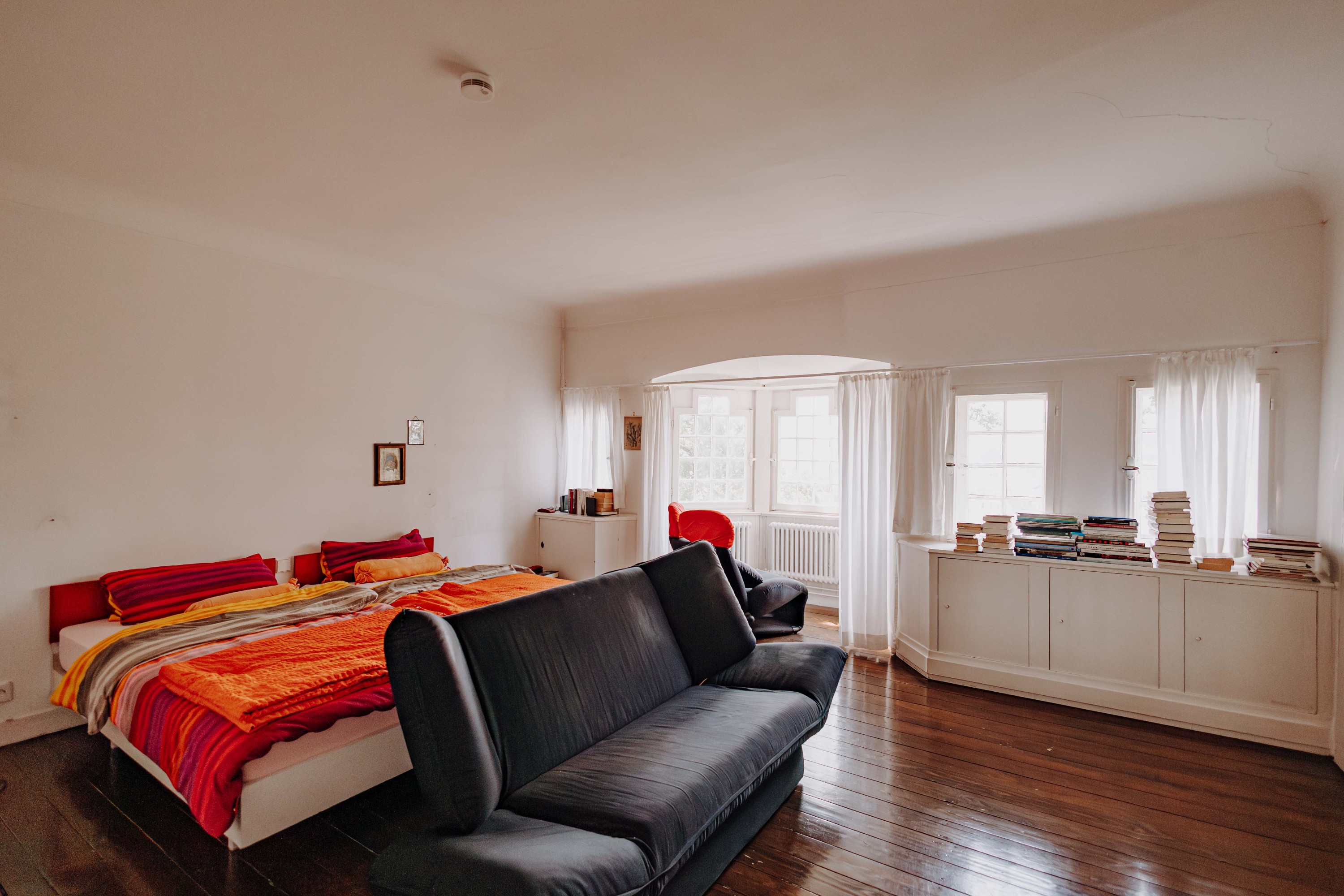 Das Obergeschoss beherbergt die Hauptschlafräume mit weitem Ausblick, ein Gästezimmer sowie ein Arbeitszimmer. Ein Ankleidezimmer und das modernisierte Bad mit Wanne, Dusche und zwei Waschbecken runden die Etage ab. Besondere Beachtung verdient das lichtdurchflutete Atelier am Ende des Flurs. Das Dachgeschoss bietet ein weiteres Zimmer zur freien Nutzung sowie zwei Bühnenräume.