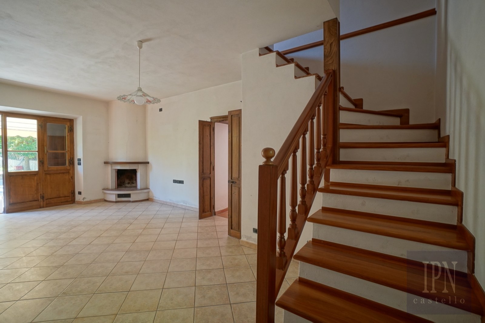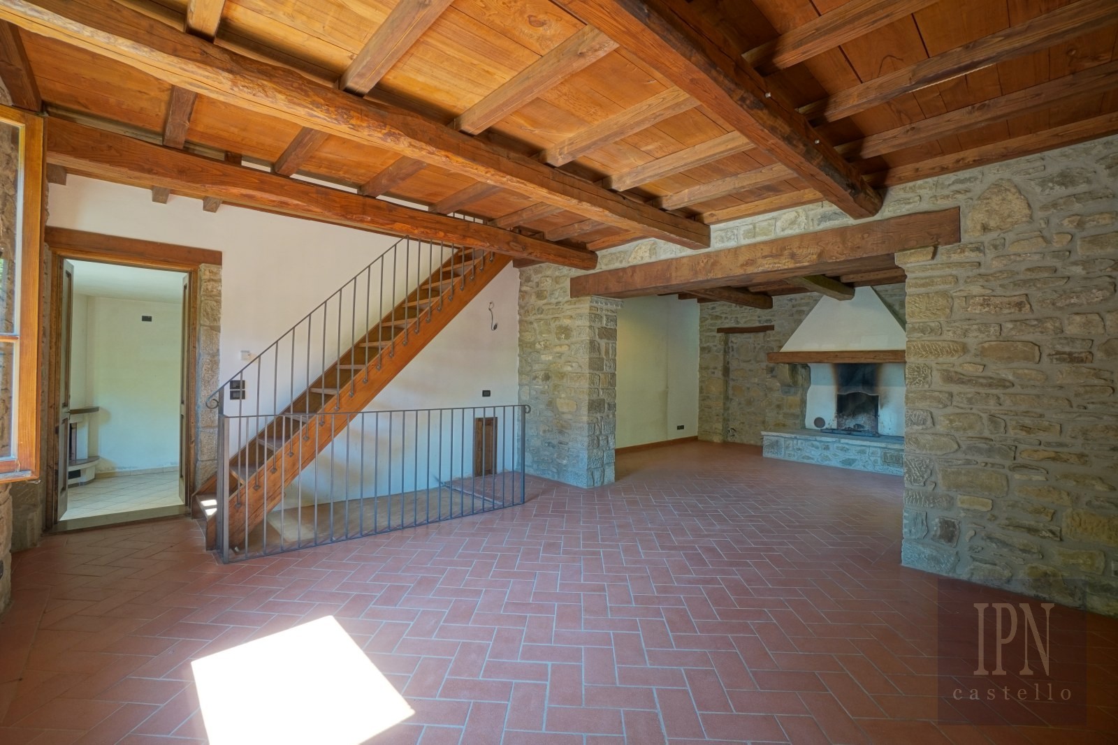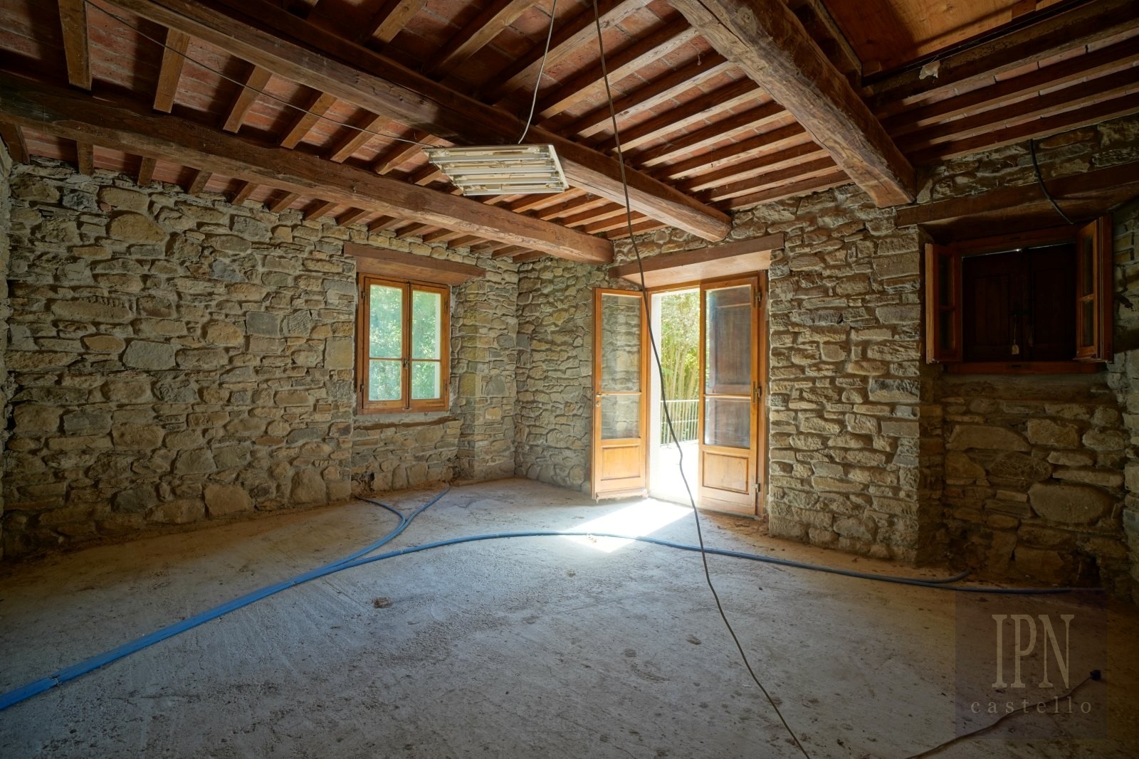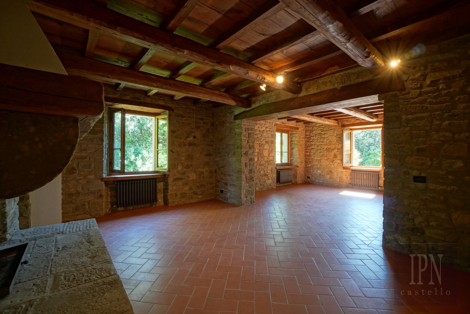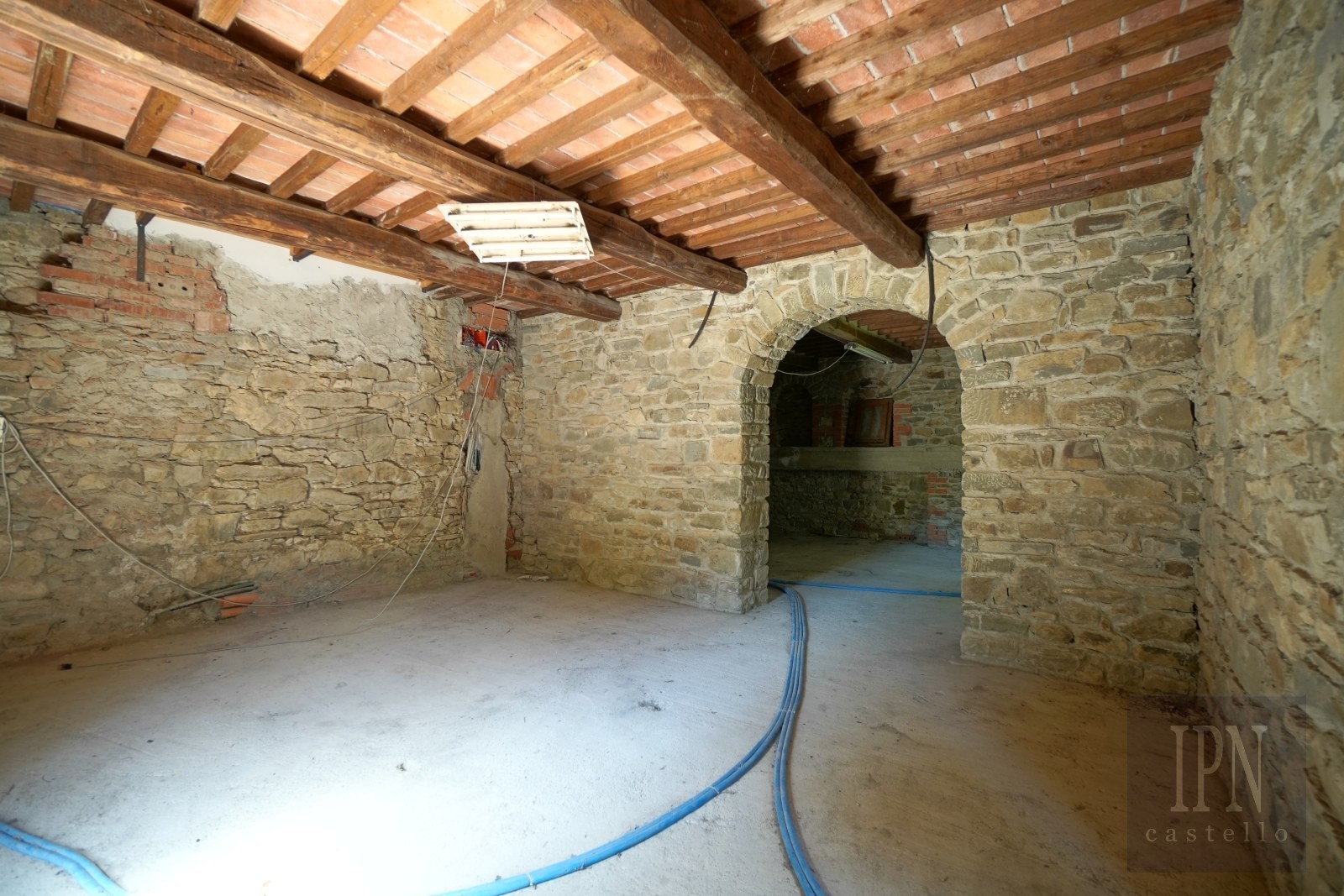 Im Inneren finden sich typische toskanische Elemente: Terrakottaböden, sichtbare Holzbalken, gewölbte Decken, Fenster und Türen mit Stein- und Ziegelrahmen sowie ein imposanter Kamin im Zentrum des Wohnbereichs. Die Aufteilung umfasst drei Schlafzimmer, zwei Badezimmer, eine traditionelle Küche, ein geräumiges Wohnzimmer, Abstellräume und noch nicht fertiggestellte Flächen, die erweitert oder individuell gestaltet werden können. Das Haus kann leicht in zwei unabhängige Einheiten aufgeteilt werden.