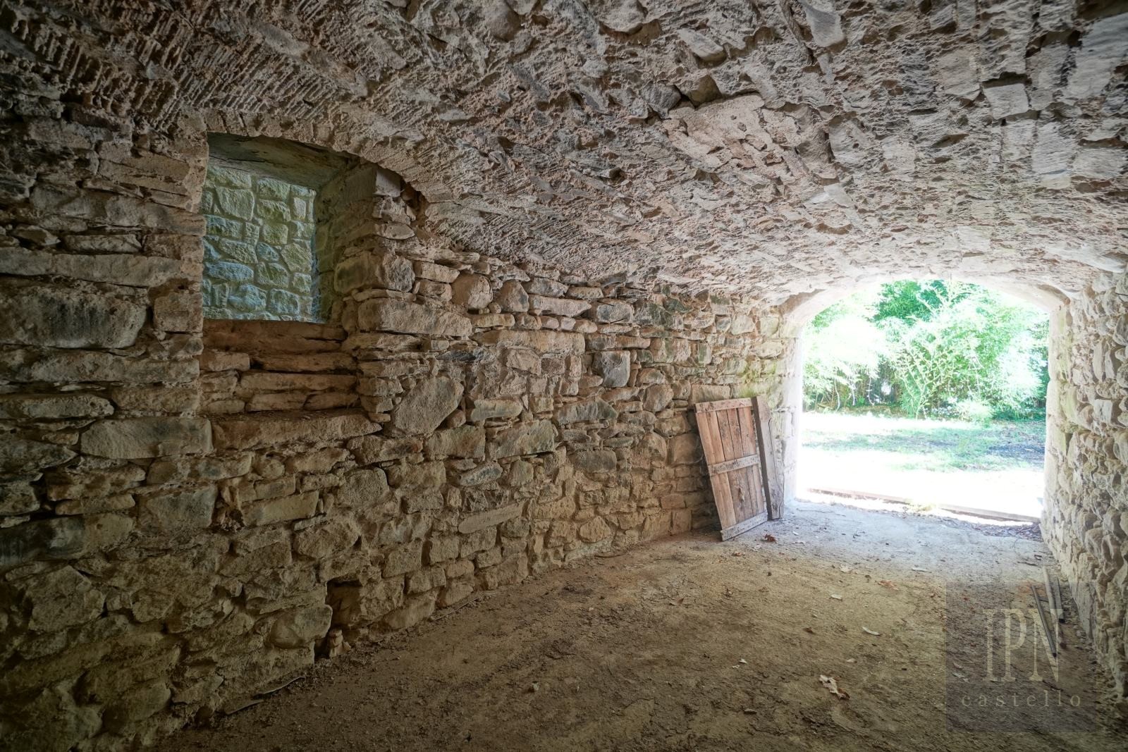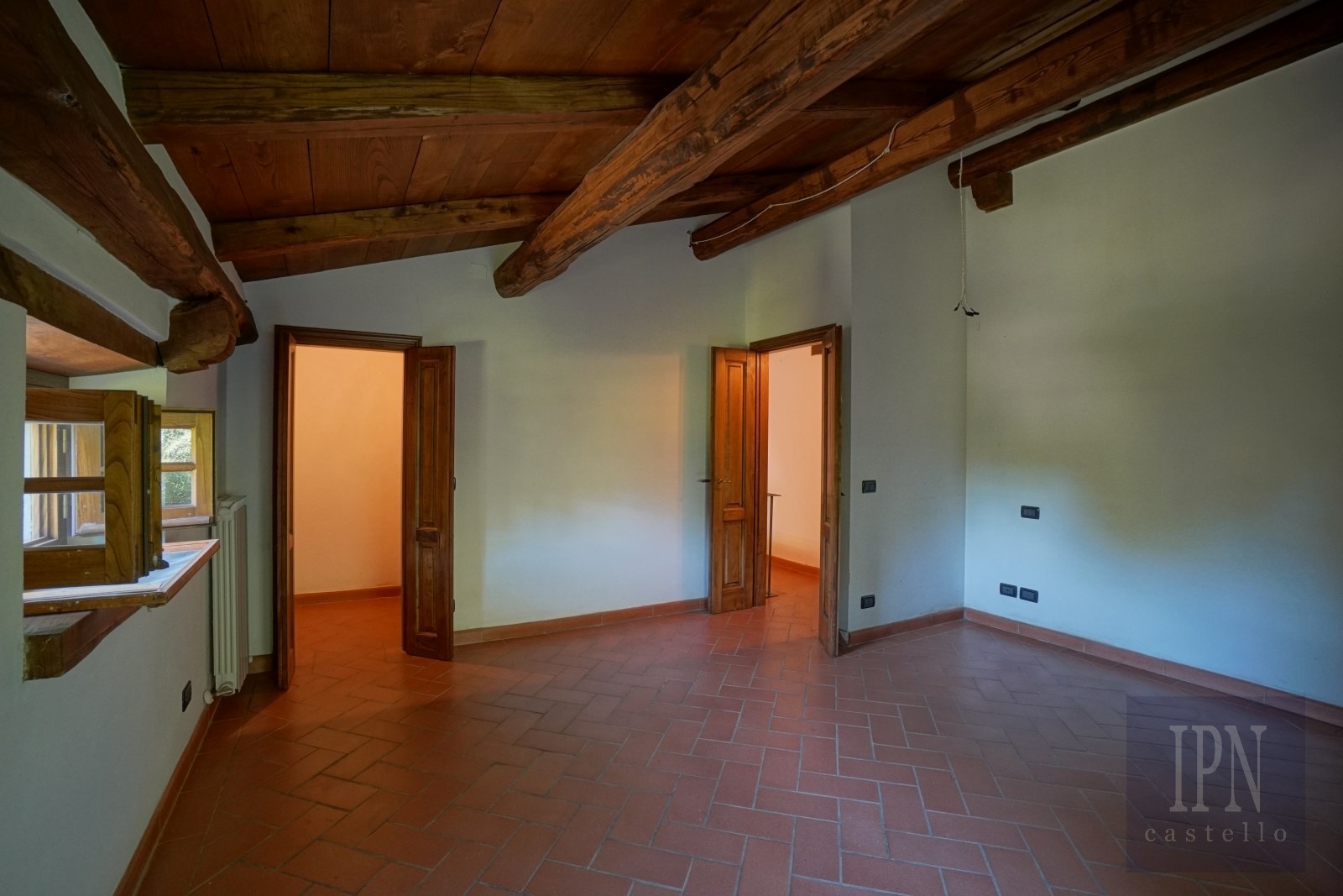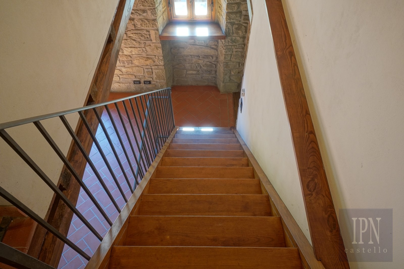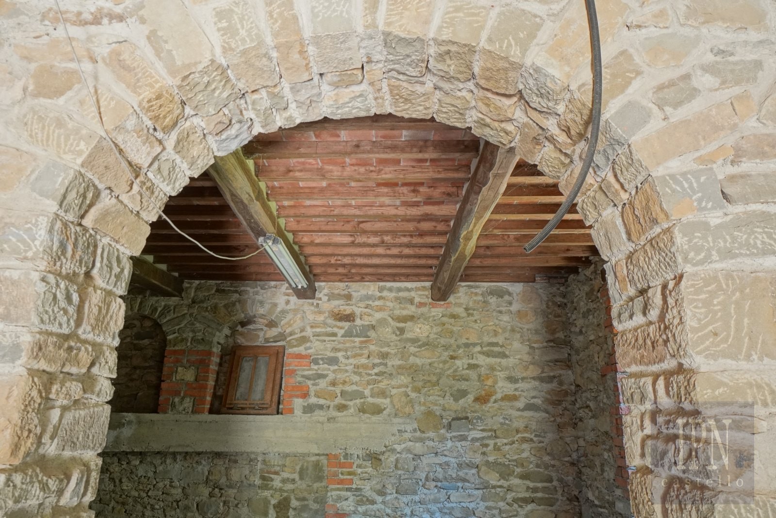 Im Inneren finden sich typische toskanische Elemente: Terrakottaböden, sichtbare Holzbalken, gewölbte Decken, Fenster und Türen mit Stein- und Ziegelrahmen sowie ein imposanter Kamin im Zentrum des Wohnbereichs. Die Aufteilung umfasst drei Schlafzimmer, zwei Badezimmer, eine traditionelle Küche, ein geräumiges Wohnzimmer, Abstellräume und noch nicht fertiggestellte Flächen, die erweitert oder individuell gestaltet werden können. Das Haus kann leicht in zwei unabhängige Einheiten aufgeteilt werden.
