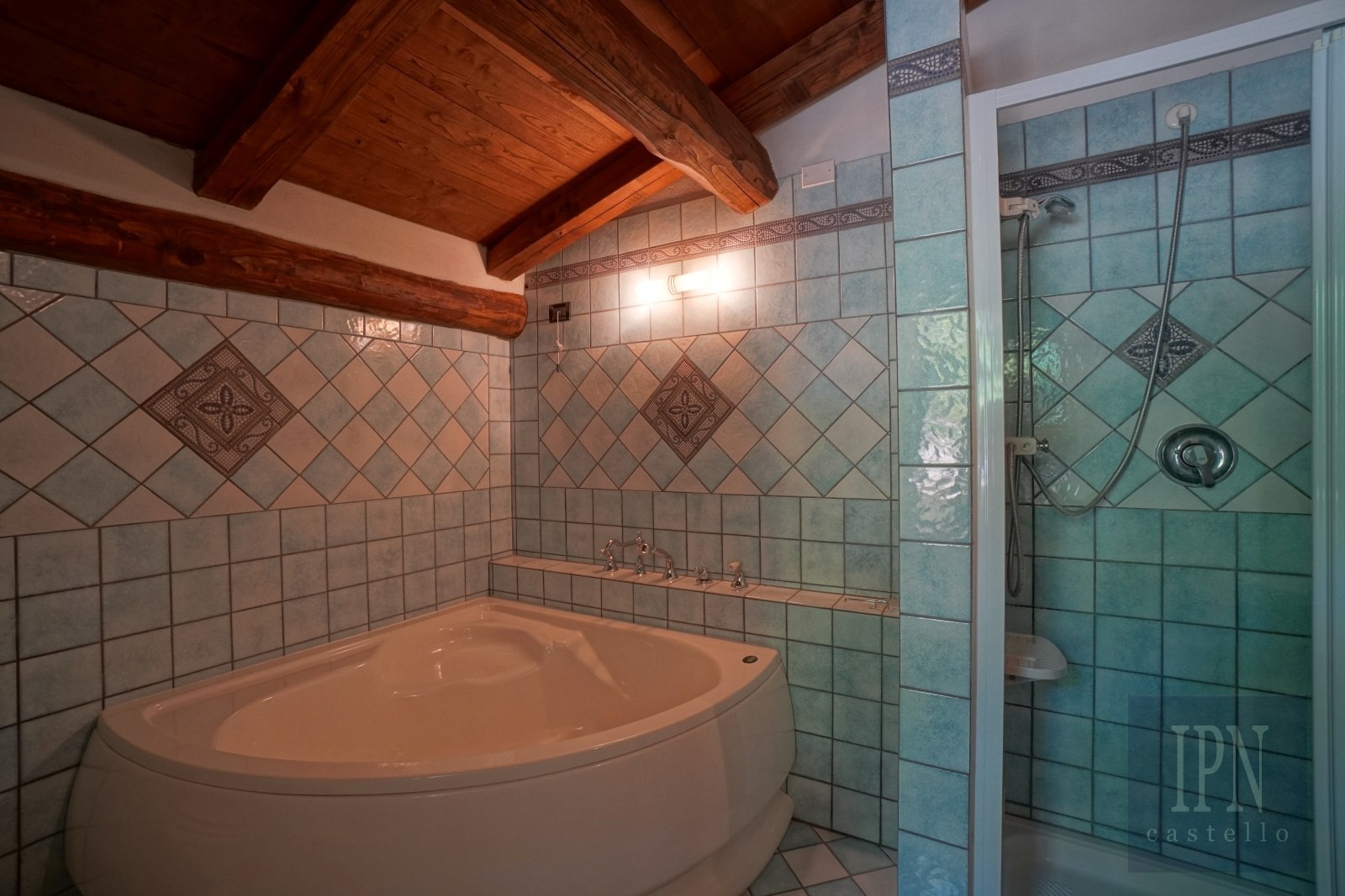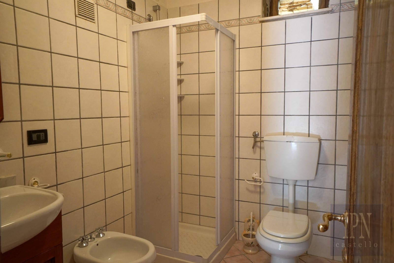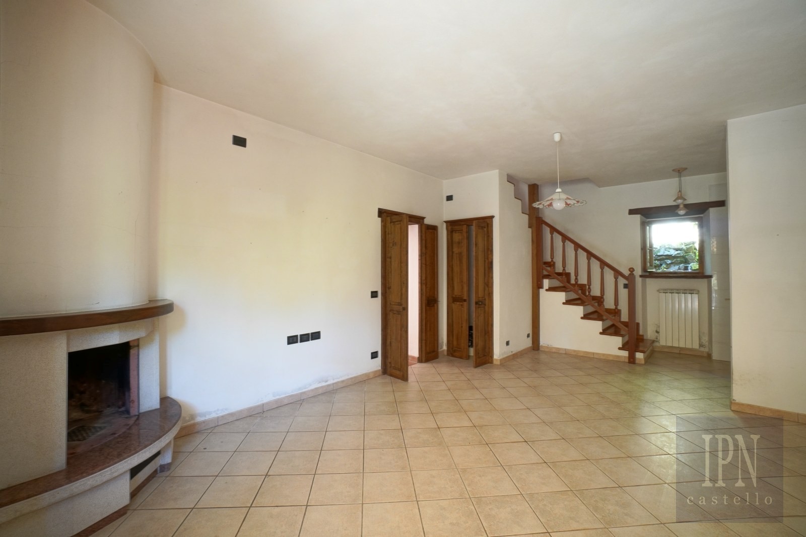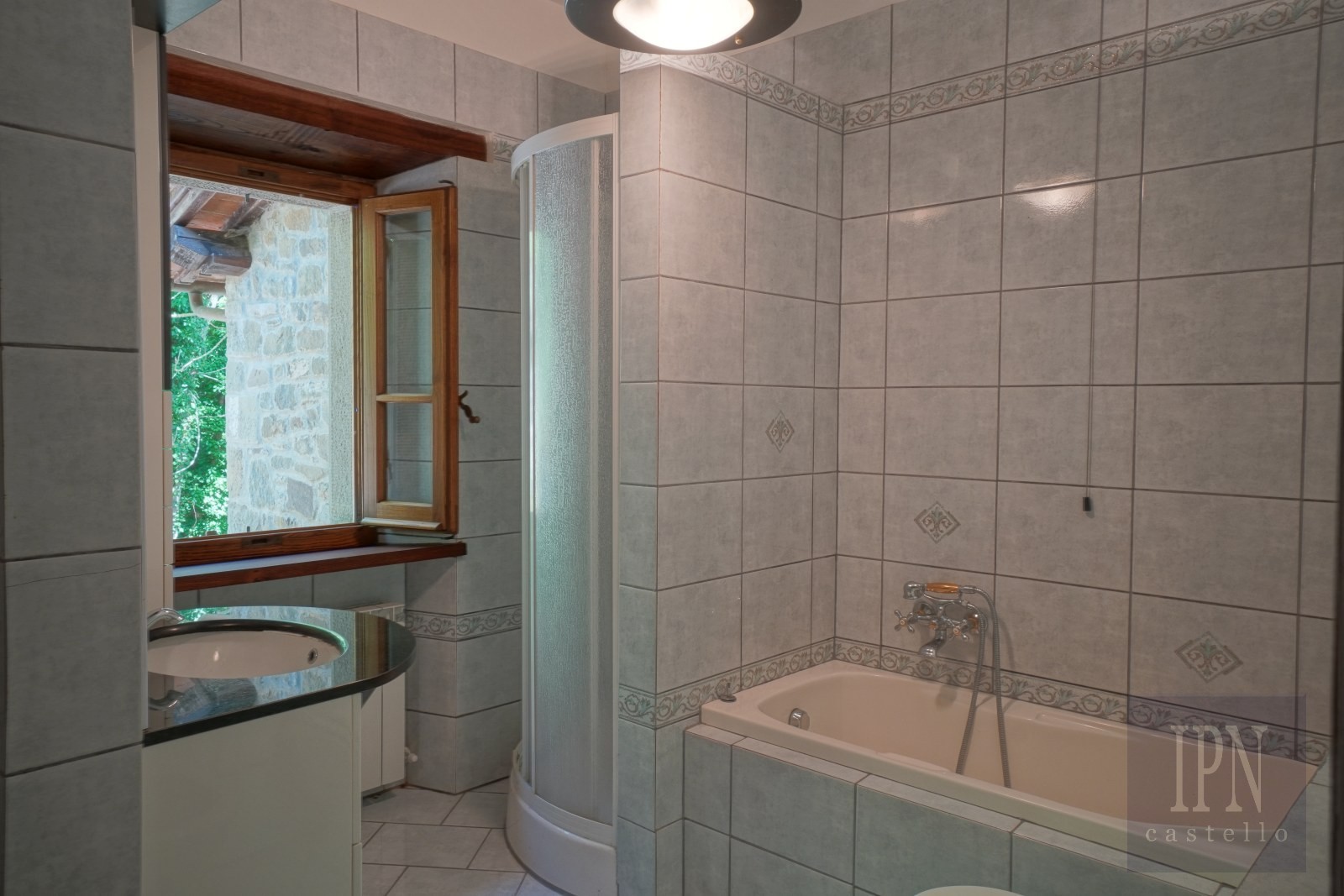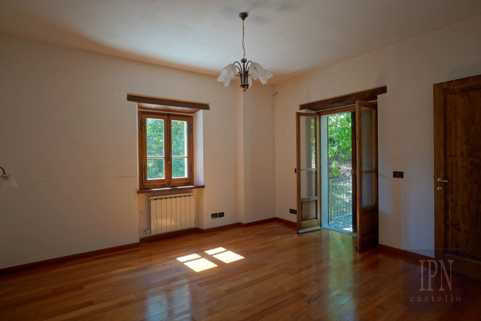 Im Inneren finden sich typische toskanische Elemente: Terrakottaböden, sichtbare Holzbalken, gewölbte Decken, Fenster und Türen mit Stein- und Ziegelrahmen sowie ein imposanter Kamin im Zentrum des Wohnbereichs. Die Aufteilung umfasst drei Schlafzimmer, zwei Badezimmer, eine traditionelle Küche, ein geräumiges Wohnzimmer, Abstellräume und noch nicht fertiggestellte Flächen, die erweitert oder individuell gestaltet werden können. Das Haus kann leicht in zwei unabhängige Einheiten aufgeteilt werden.