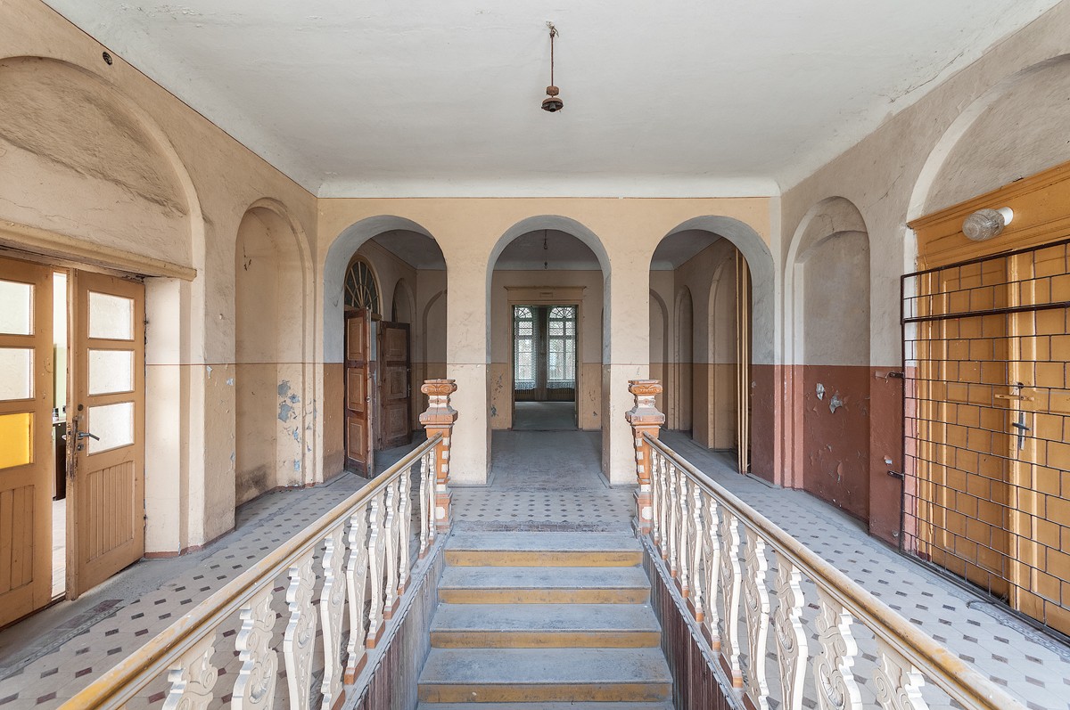 Ein gerader Treppenaufgang führt in die geräumige Halle im Oberschoss mit Zugang zu repräsentativen Bereichen und zum einst reich dekorierten Festsaal, der seinen repräsentativen Charakter im Zuge der Nachkriegsnutzungen verloren hat. Daneben ist die originale Raumanordnung mit architektonischen Details aus der Entstehungszeit weitgehend erhalten, darunter historische Böden, stuckierte Decken, Bodenfliesen, massive Türen sowie Kamine und Kachelöfen.