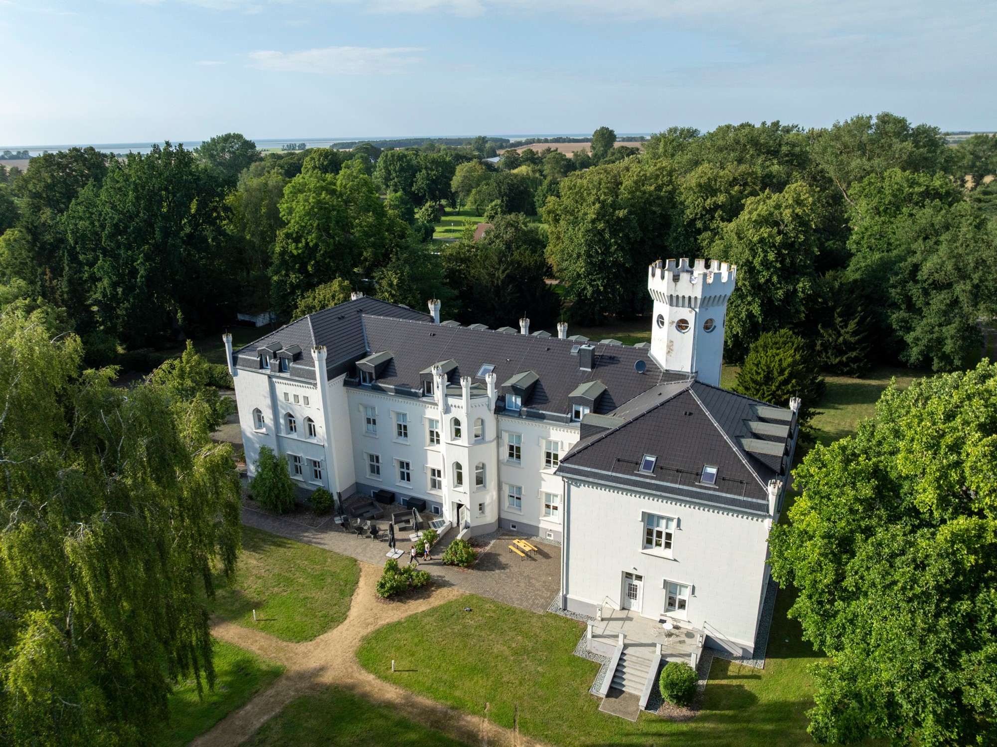 Das Herrenhaus "Schloss Hohendorf", erbaut 1854 von Karl-Friedrich Schinkel, liegt in Gross Mohrdorf im Landkreis Vorpommern-Rügen, Mecklenburg-Vorpommern. Die Lage verbindet historischen Charme mit unmittelbarer Nähe zur Ostsee und der Insel Rügen. Der nächste Strand liegt ca. 10 km entfernt, Stralsund erreichen Sie in rund 35 km, die Insel Rügen mit ihren berühmten Kreidefelsen und Stränden in ca. 25 km. Zingst, bekannt für Naturerlebnisse und die Boddenlandschaft, ist etwa 20 km entfernt.