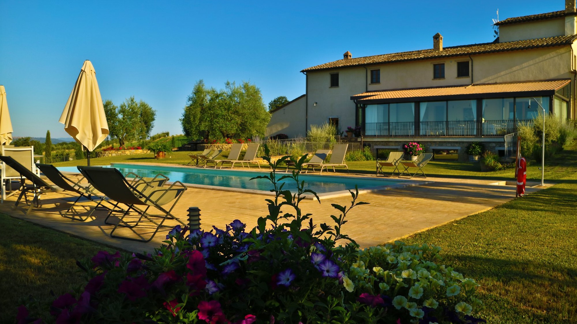 Grenzgebiet zwischen Toskana und Umbrien. Montalcino, Pienza, Montepulciano und Cortona sind über Landstraßen erreichbar. Der Trasimenische See liegt 30 km entfernt. Florenz und Rom sind über die bestehende Verkehrsinfrastruktur angebunden.