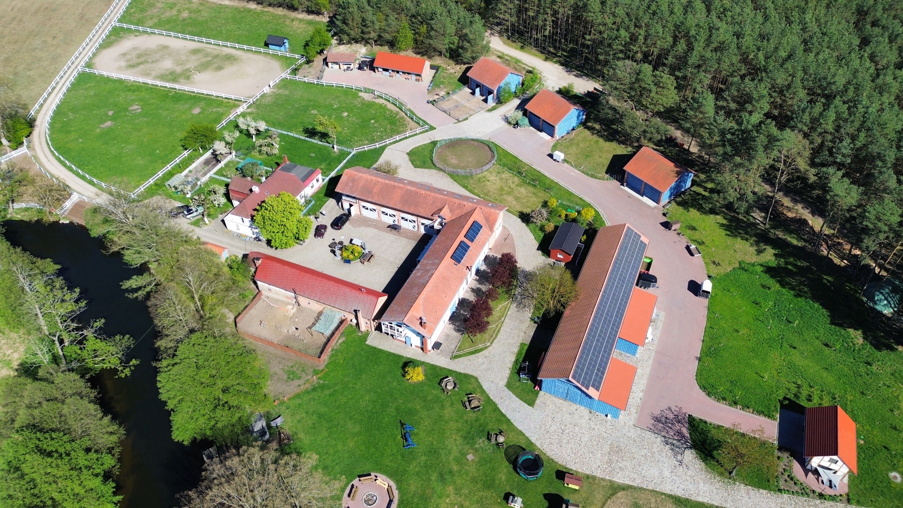 - Großer Stall mit Pferdeboxen (teilweise Außenboxen)