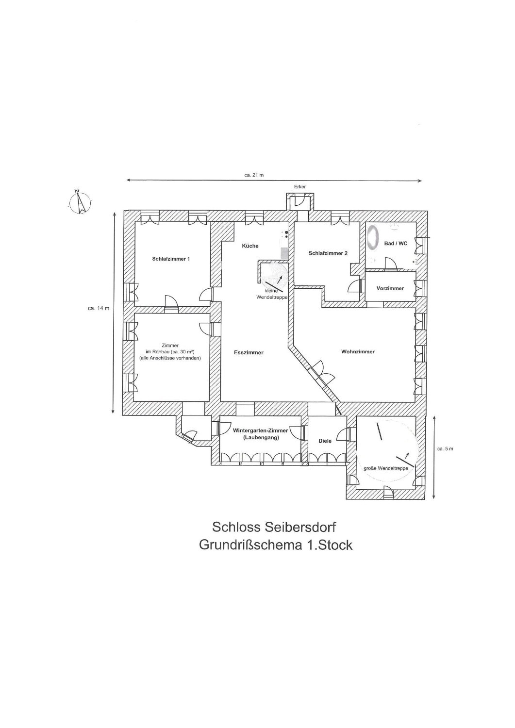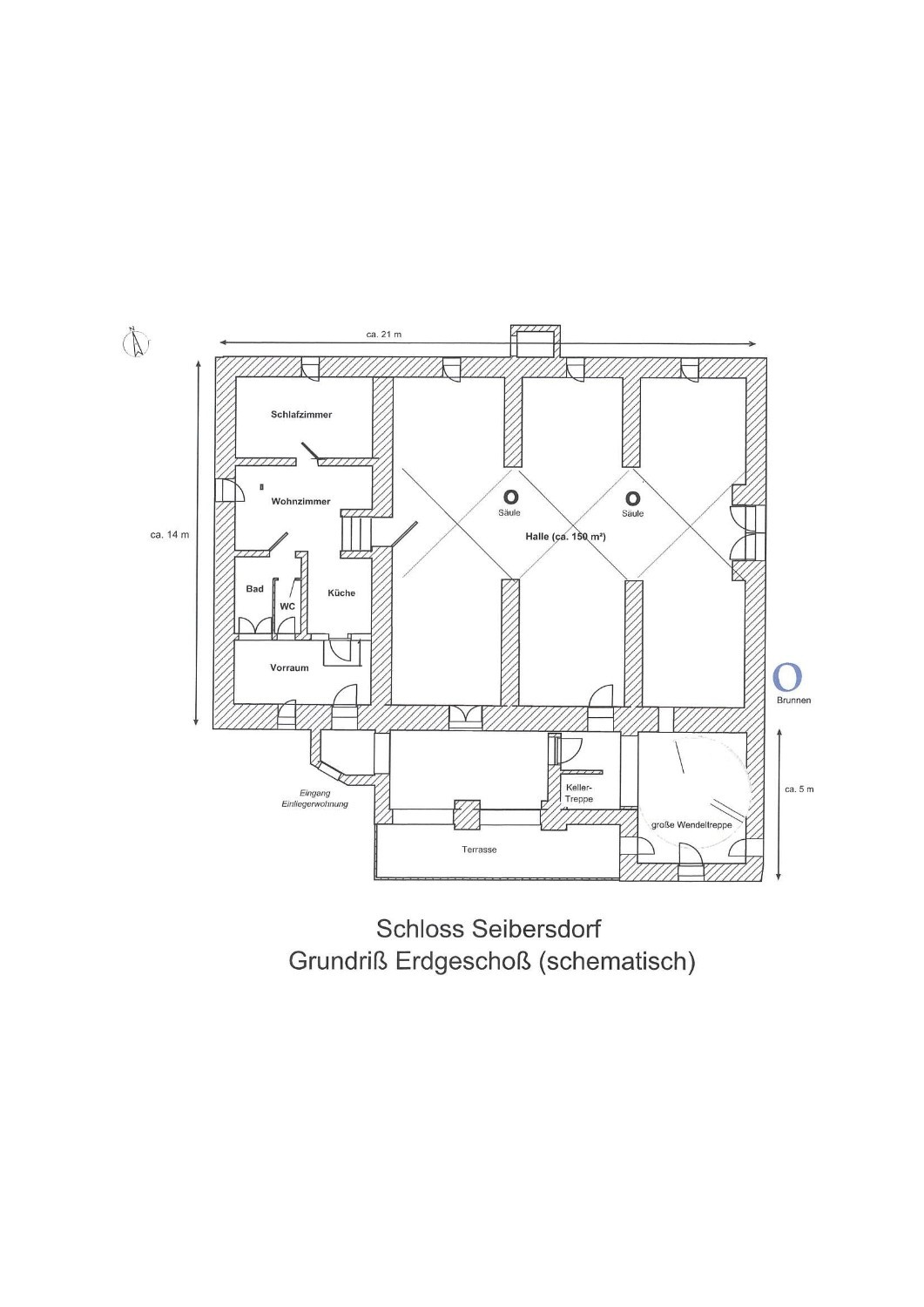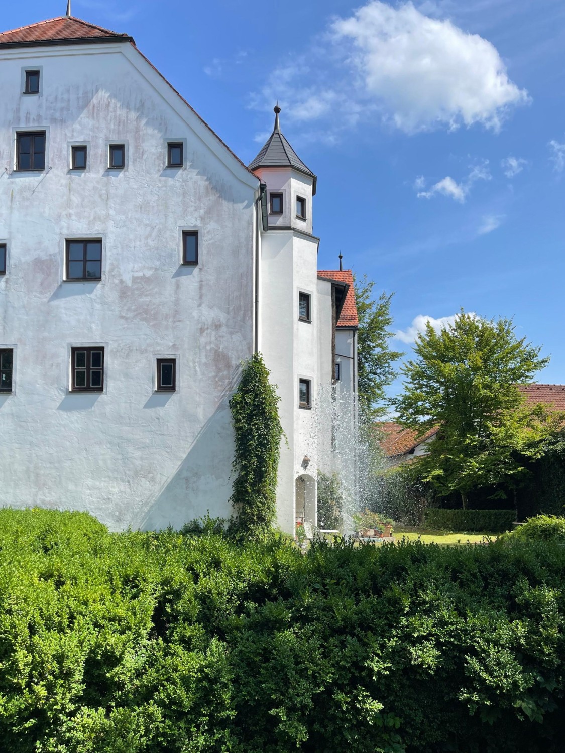 Château tardif médiéval Seibersdorf (XIIe/XVe siècle) situé dans le village du même nom (325 habitants), sur une terrasse ensoleillée surplombant la vallée de l’Inn. Cadre calme et privé dans un grand jardin d’environ 4 400 m² avec chênes, hêtres et tilleuls anciens. Le terrain en pente sud-ouest comprend un biotope avec étangs et ruisseaux, un puits artésien (environ 200 m de profondeur), une grande fontaine et un puits historique devant le portail du château. À l’est, la place du village.