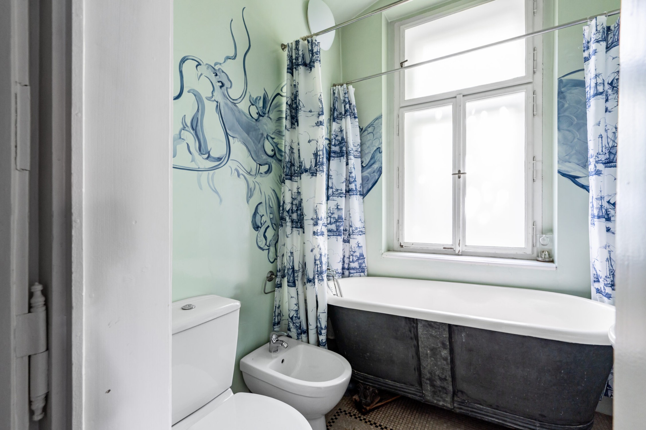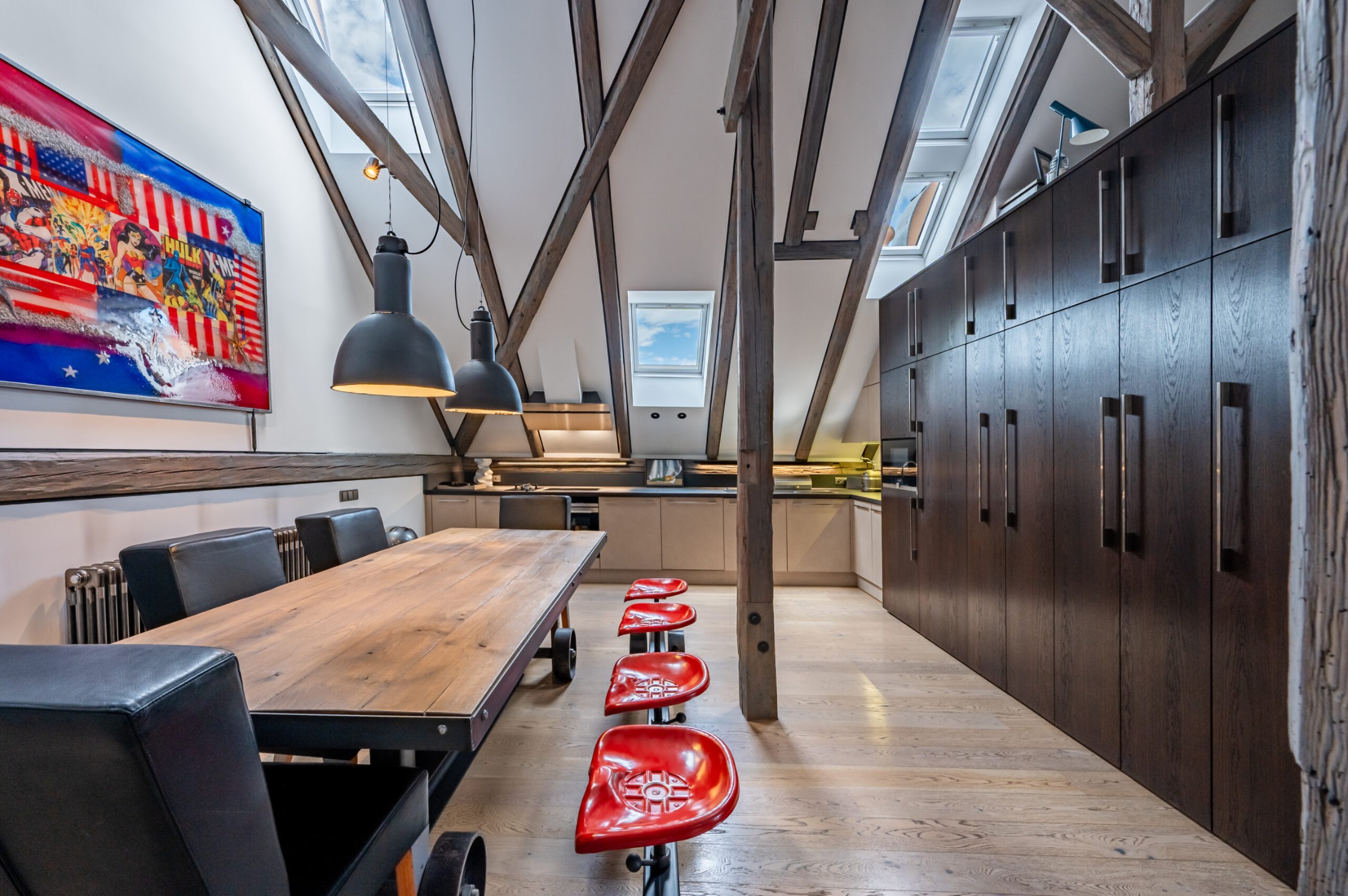 La demeure s’étend sur cinq étages avec 20 pièces uniques, chacune possédant son propre caractère. Parmi les particularités architecturales, on trouve des chambres d’inspiration orientale, un salon doré ainsi qu’un loft contemporain sous les combles avec accès à la terrasse.