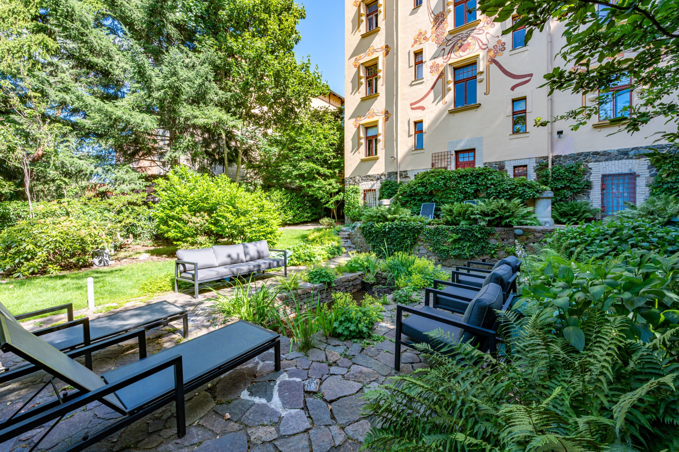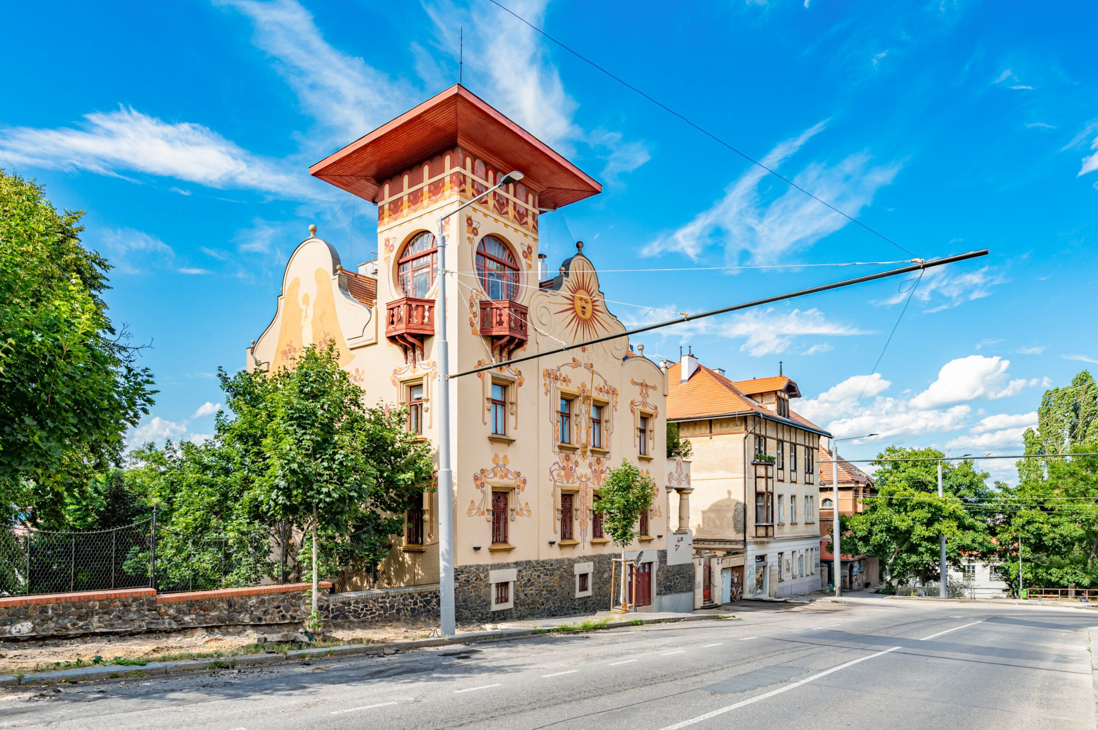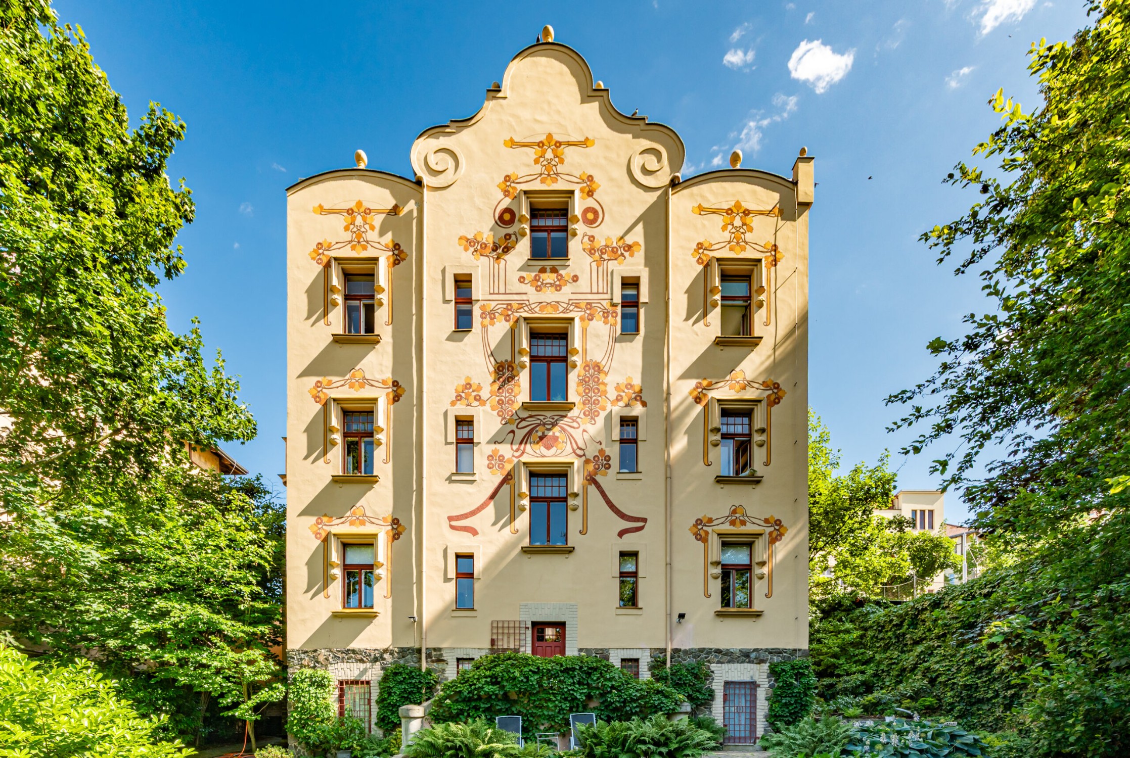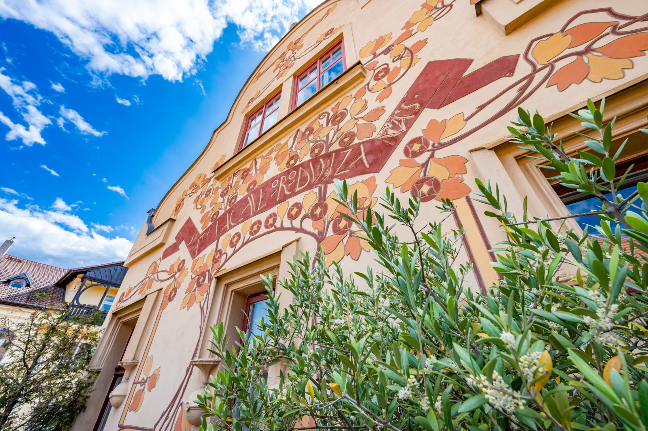 La façade de la demeure a été imaginée et réalisée par le célèbre peintre académique František Kobliha. Son héritage artistique se reflète dans les détails ornementaux, les fresques, la figure de l’ange et le cadran solaire, chaque élément témoignant de l’authentique esthétique moderniste.
