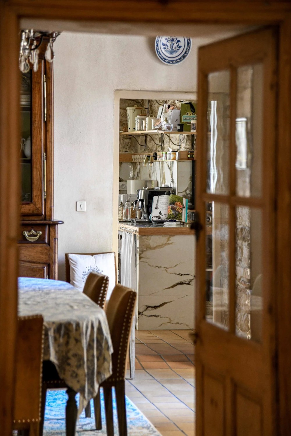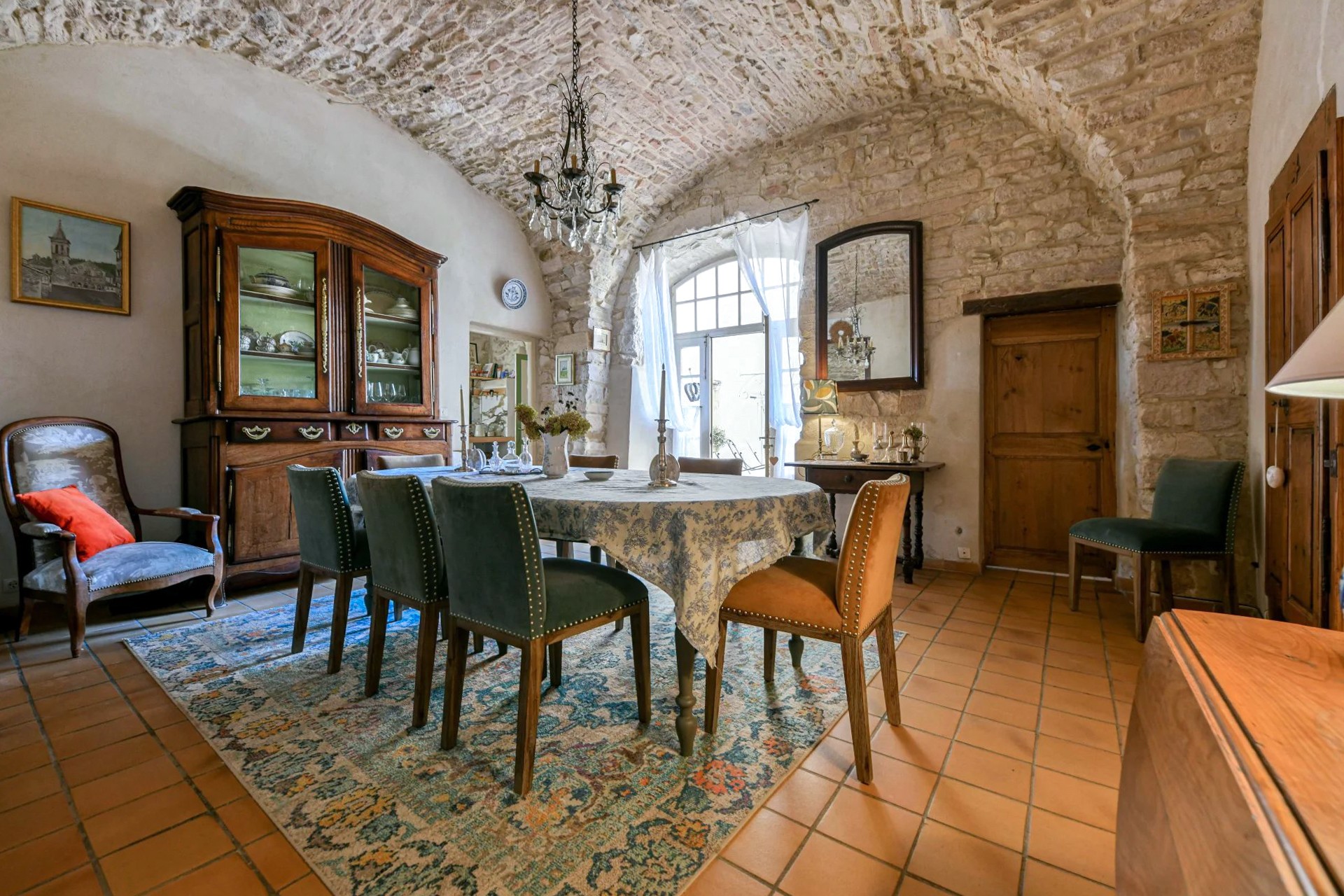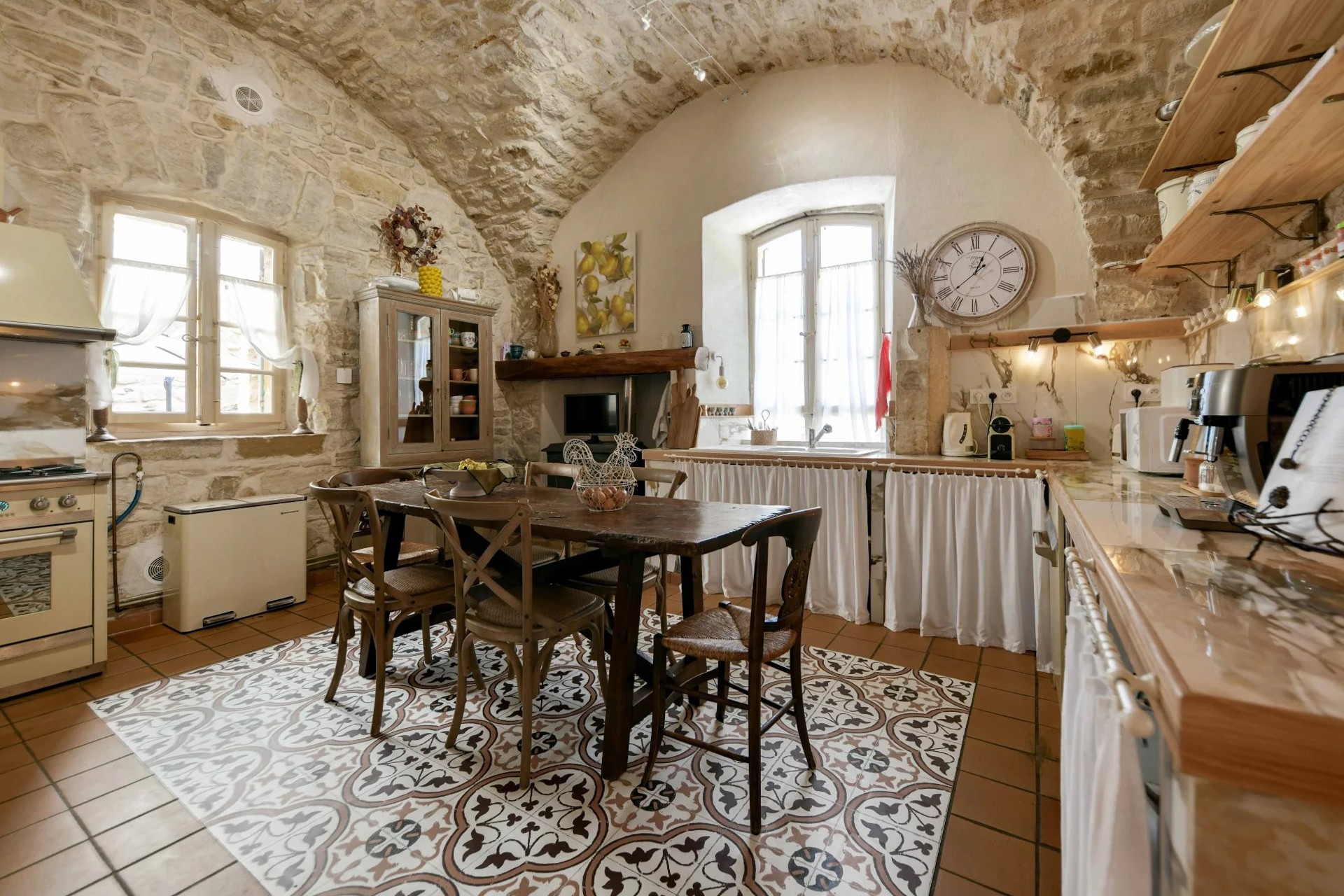 Dès l’entrée, le rez-de-chaussée séduit par un salon lumineux au plafond voûté en pierre, ouvert sur une vaste cour végétalisée. La piscine, équipée d’un système jacuzzi, s’intègre harmonieusement dans cet écrin de verdure. La cuisine attenante, elle aussi sous voûtes, est prolongée par un cellier spacieux avec cave intégrée. Une salle à manger voûtée complète ce niveau, offrant des espaces de vie chaleureux et accueillants.