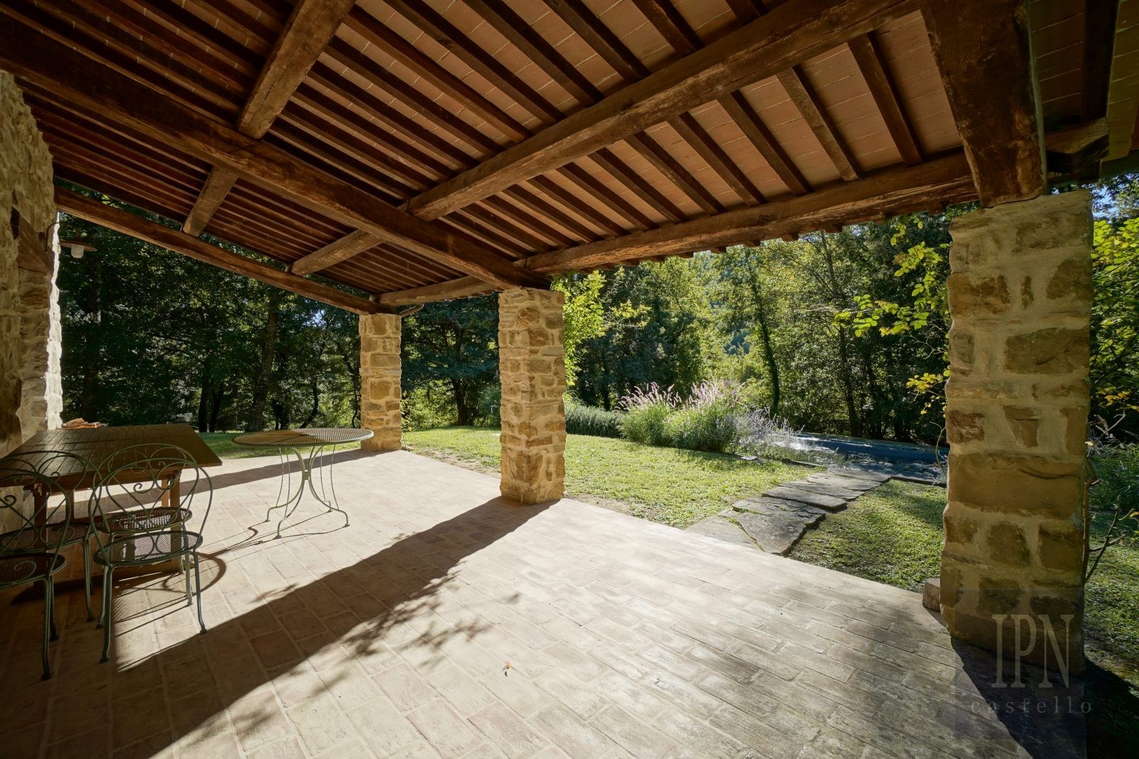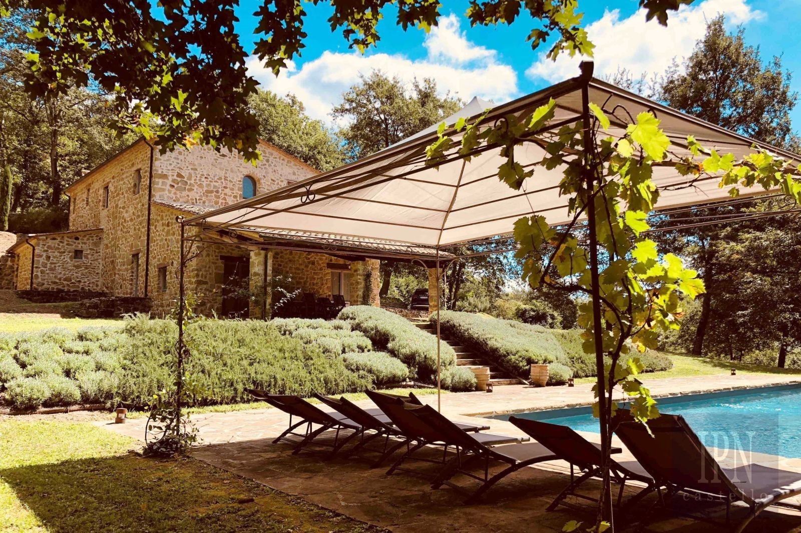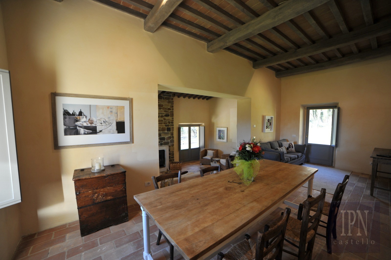 La casa è spaziosa e piena di carattere, distribuita su due piani. Al piano terra, l’area giorno si sviluppa su tre livelli, conferendo fluidità e personalità agli spazi. Al livello superiore si trova la cucina completamente attrezzata, che si apre su una pergola coperta da glicini con un grande tavolo, ideale per pranzi o cene all’aperto. Alcuni gradini più in basso si trova la sala da pranzo principale, oltre a un soggiorno confortevole con camino. Da qui, due porte finestre conducono a un’ampia pergola coperta e protetta dagli agenti atmosferici con vista sulla piscina, perfetta per serate tranquille o come secondo spazio da pranzo all’aperto.