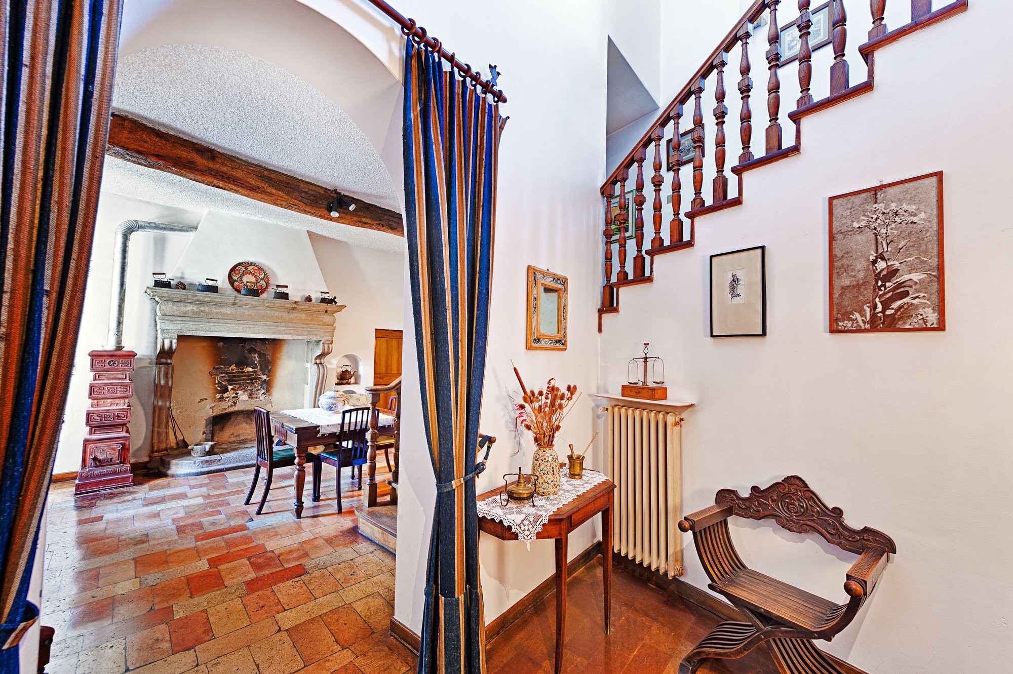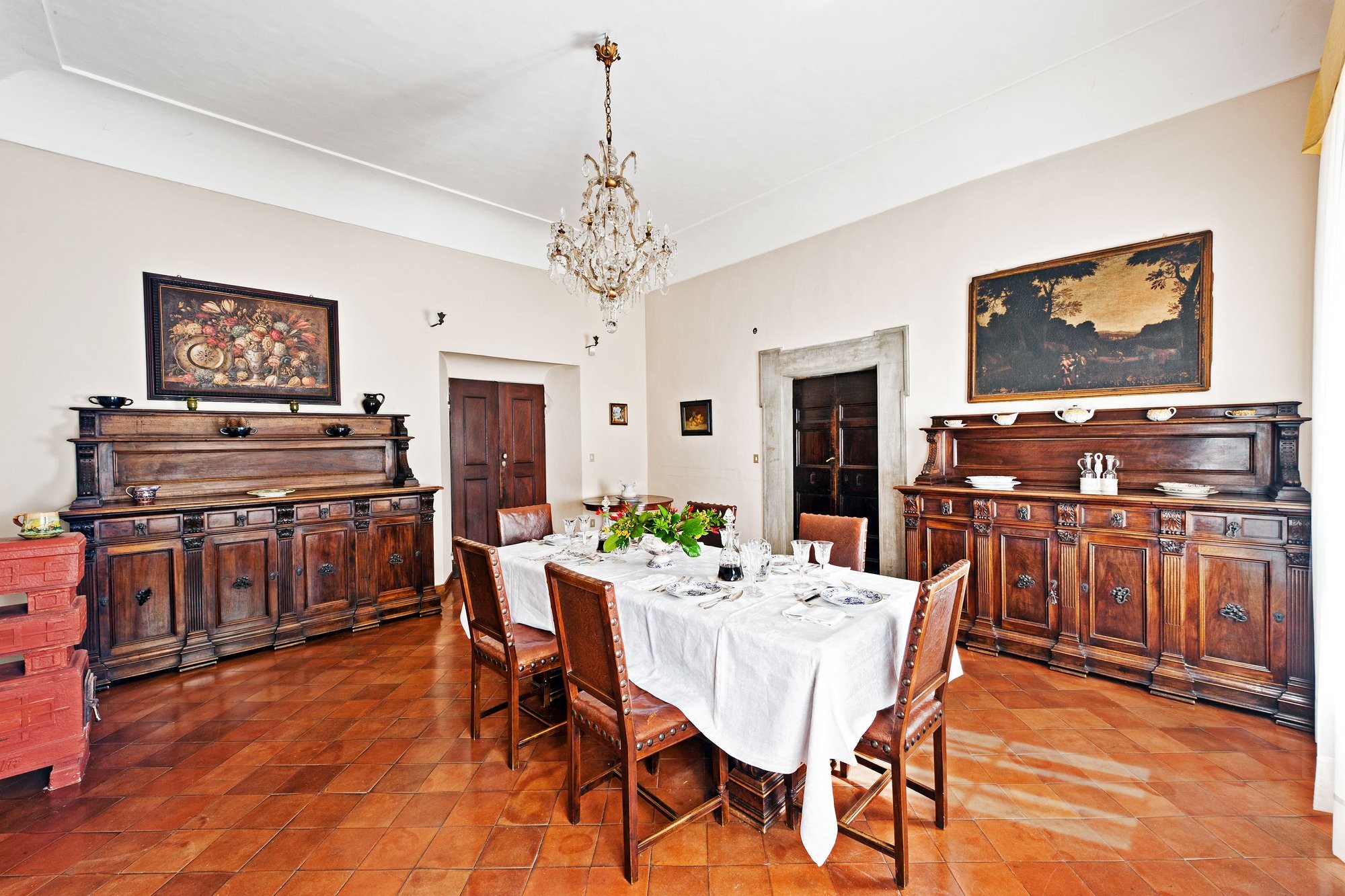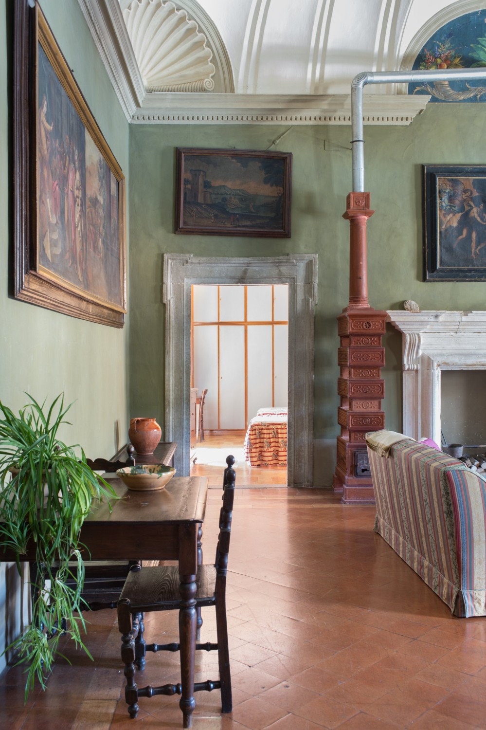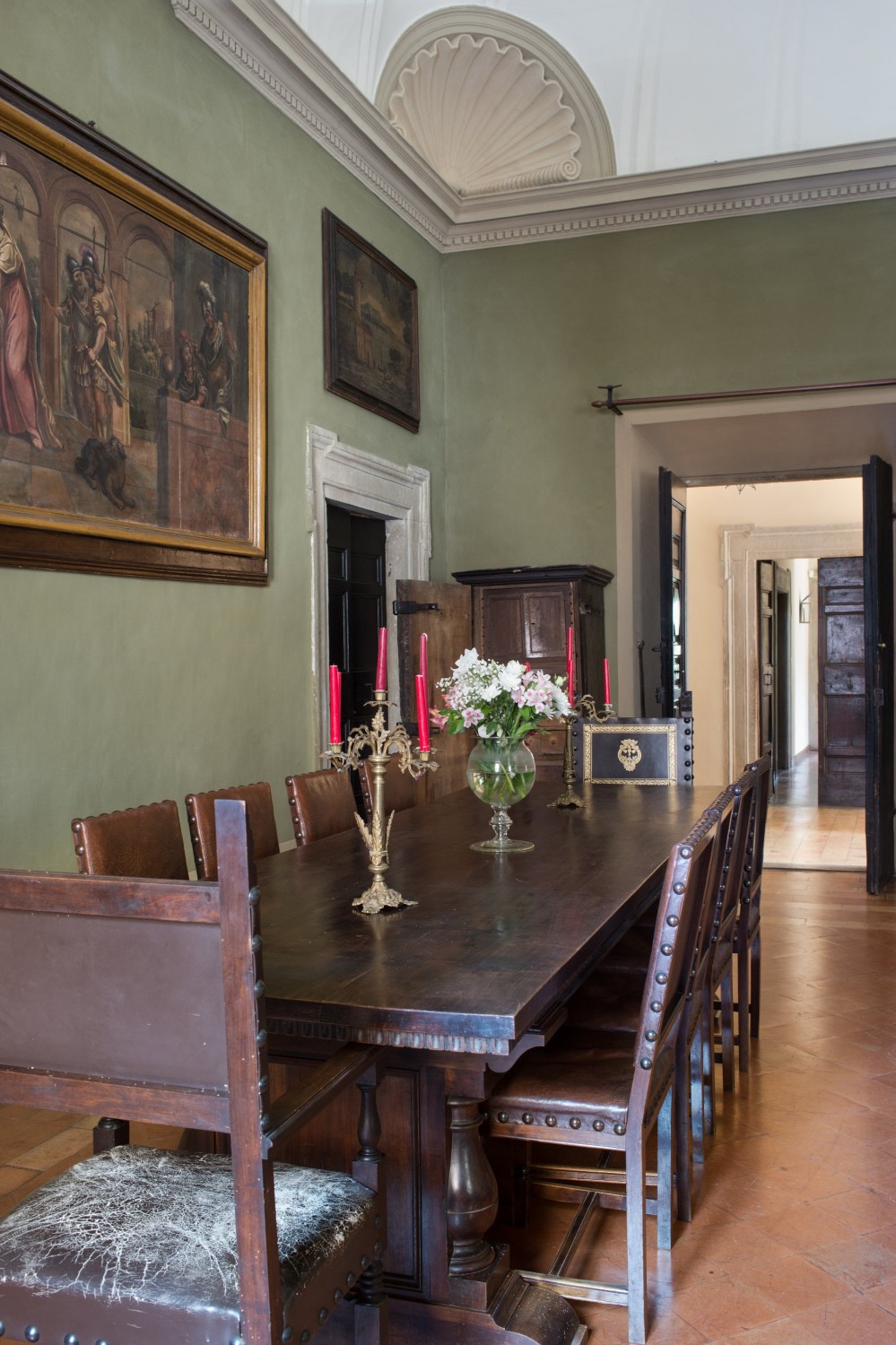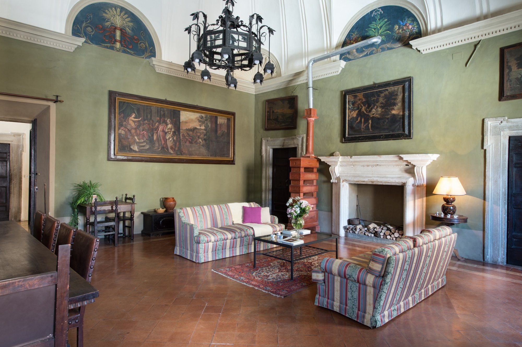 L’architettura del palazzo riflette le sue origini medievali e il suo splendore rinascimentale, con proporzioni armoniose e dettagli d’epoca perfettamente conservati. Esteso su circa 1.600 metri quadrati, il palazzo è suddiviso in due ali distinte, accessibili tramite una scalinata in pietra levigata dal tempo. L’ala sinistra ospita una splendida sala al piano nobile, decorata con affreschi rinascimentali originali e soffitti alti che raccontano cinque secoli di storia italiana. L’ala destra, invece, si sviluppa su due piani di spazi abitativi raffinati, dove il fascino storico si fonde con il comfort moderno, con porte ad arco, cornici ornate e ampie finestre che si affacciano sulla piazza e sui giardini privati.