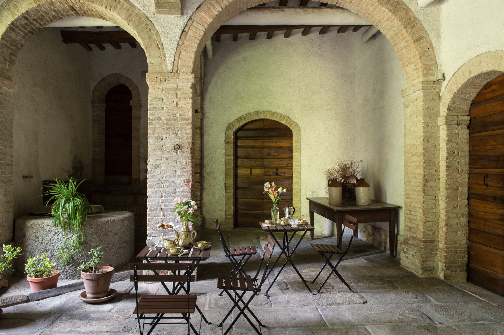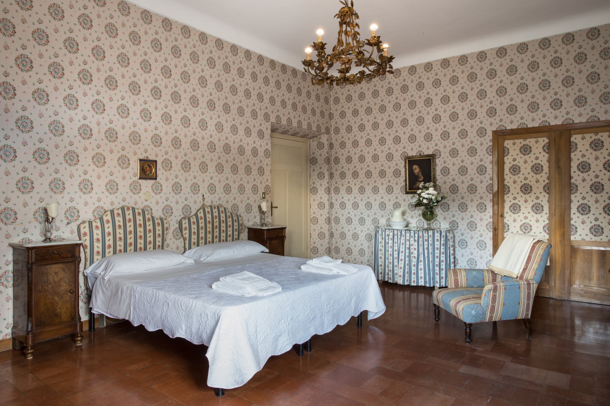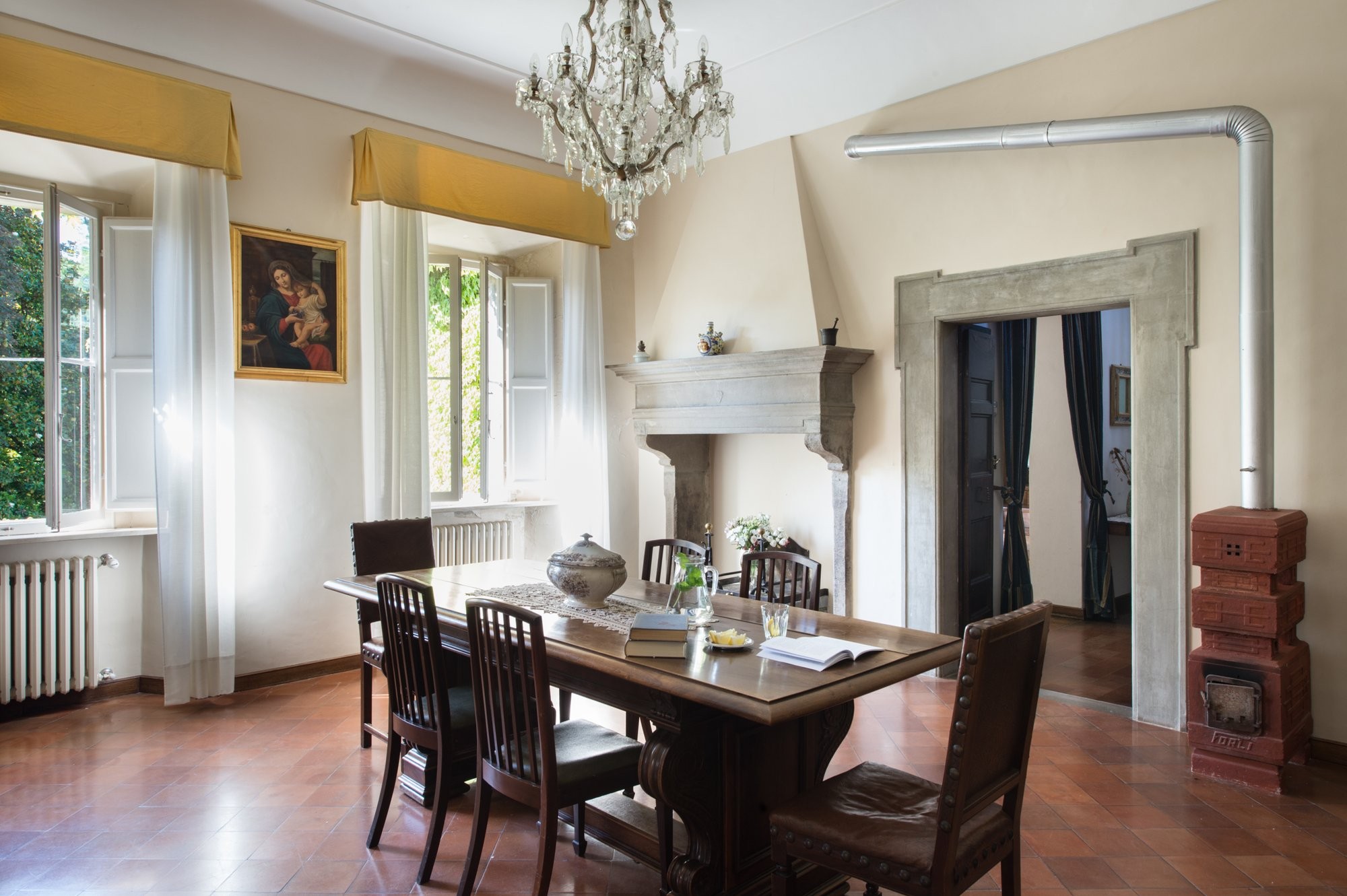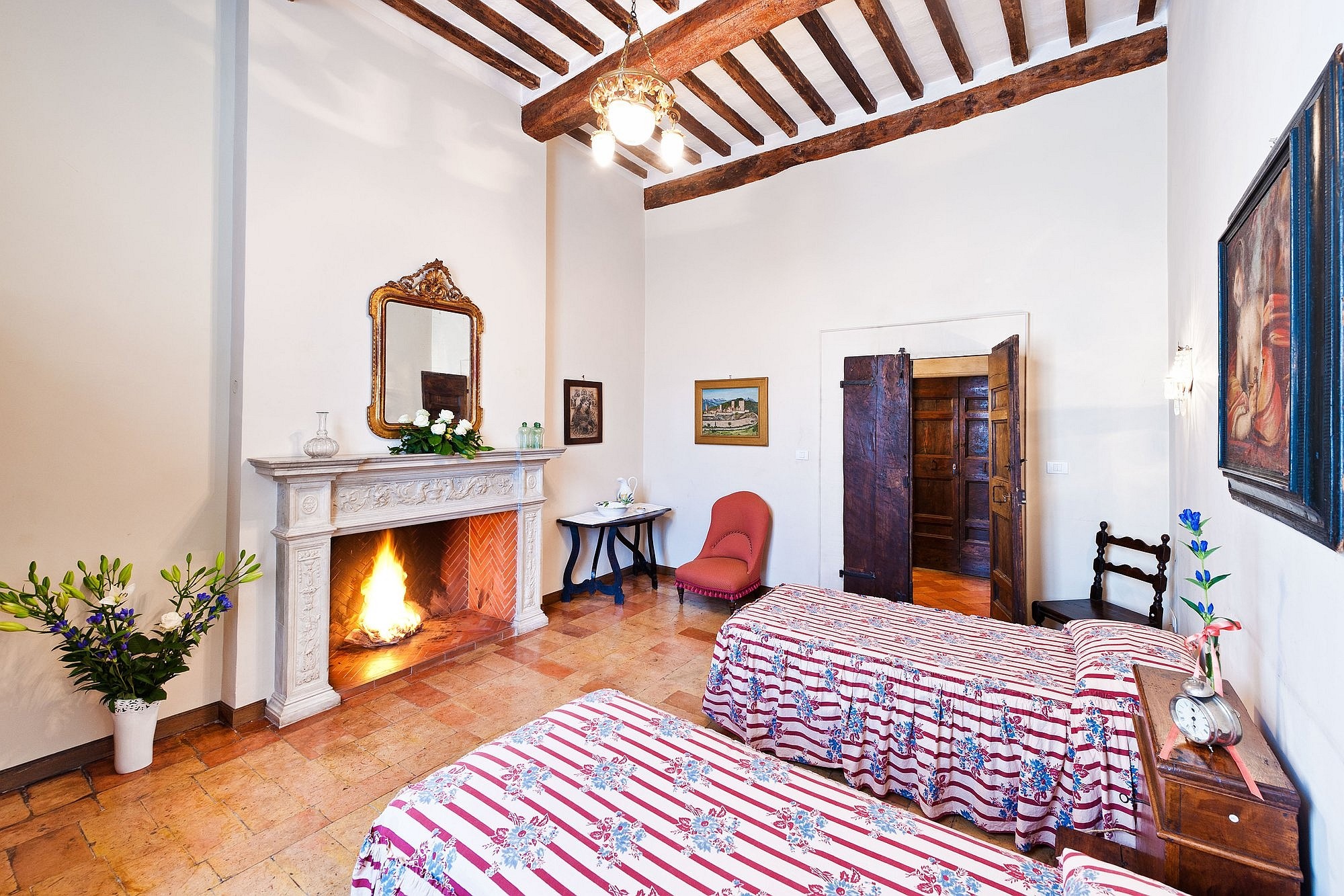 L’architettura del palazzo riflette le sue origini medievali e il suo splendore rinascimentale, con proporzioni armoniose e dettagli d’epoca perfettamente conservati. Esteso su circa 1.600 metri quadrati, il palazzo è suddiviso in due ali distinte, accessibili tramite una scalinata in pietra levigata dal tempo. L’ala sinistra ospita una splendida sala al piano nobile, decorata con affreschi rinascimentali originali e soffitti alti che raccontano cinque secoli di storia italiana. L’ala destra, invece, si sviluppa su due piani di spazi abitativi raffinati, dove il fascino storico si fonde con il comfort moderno, con porte ad arco, cornici ornate e ampie finestre che si affacciano sulla piazza e sui giardini privati.