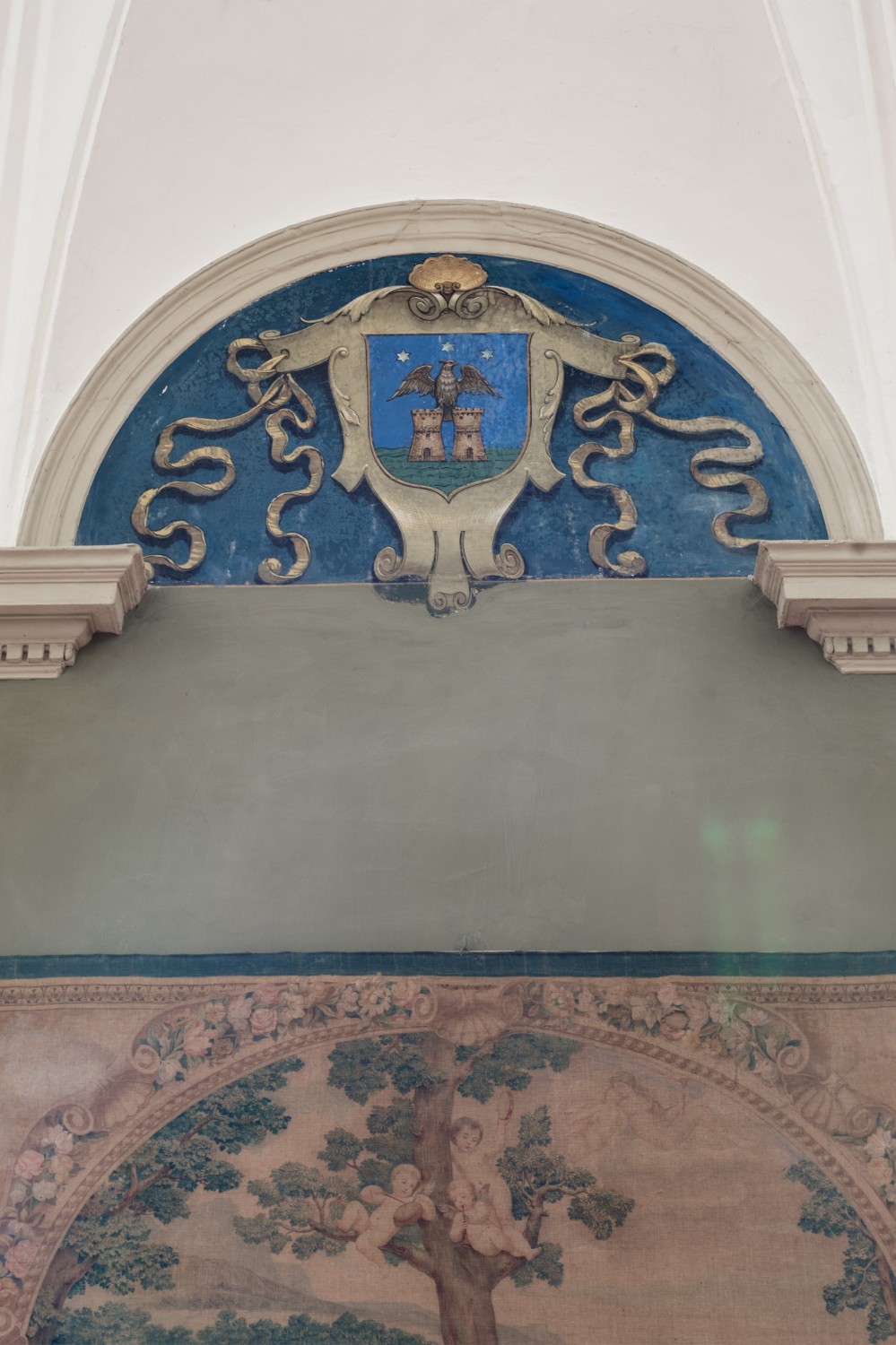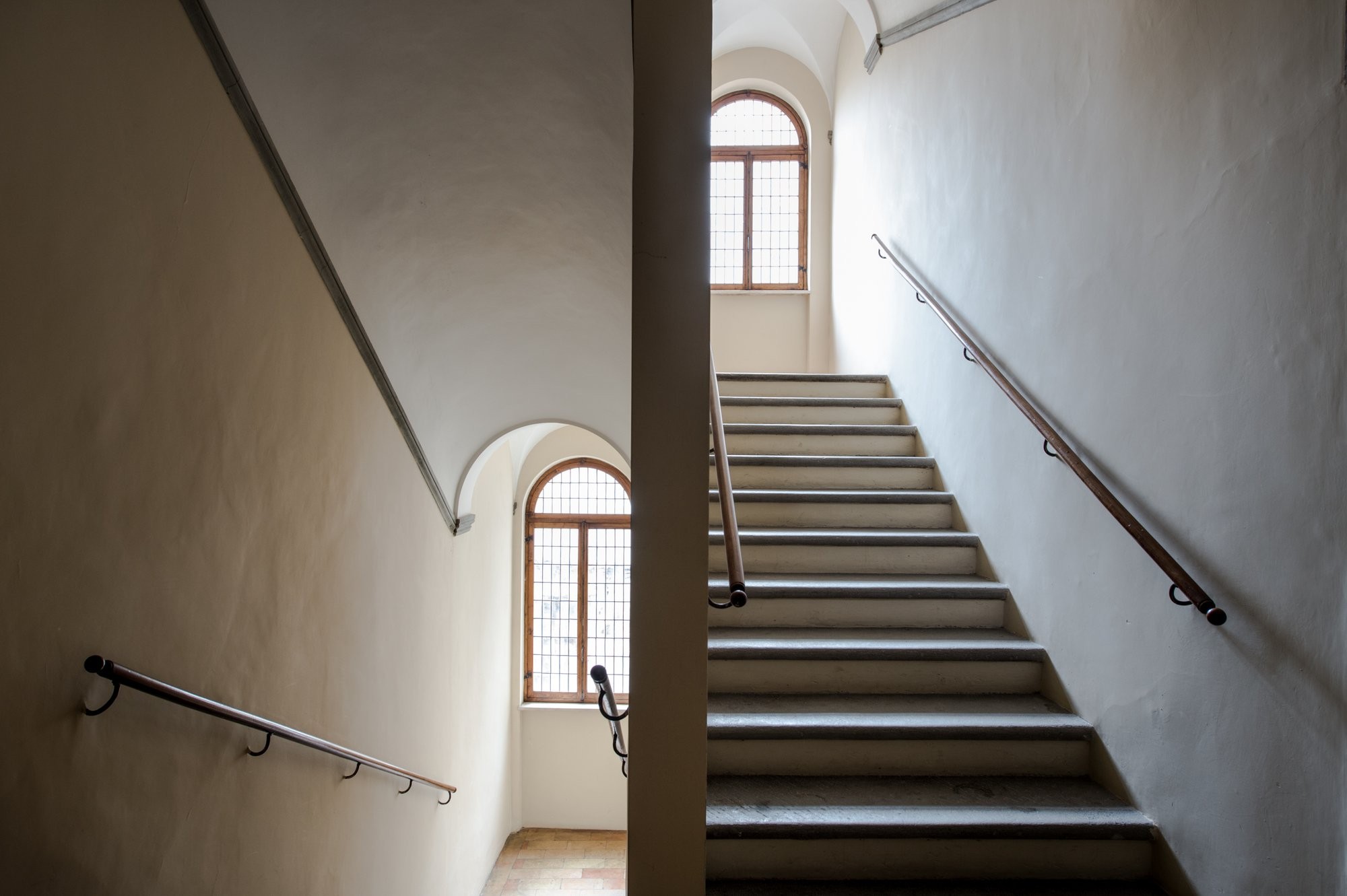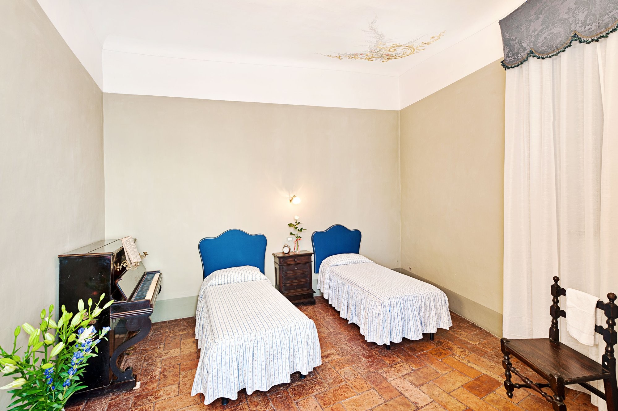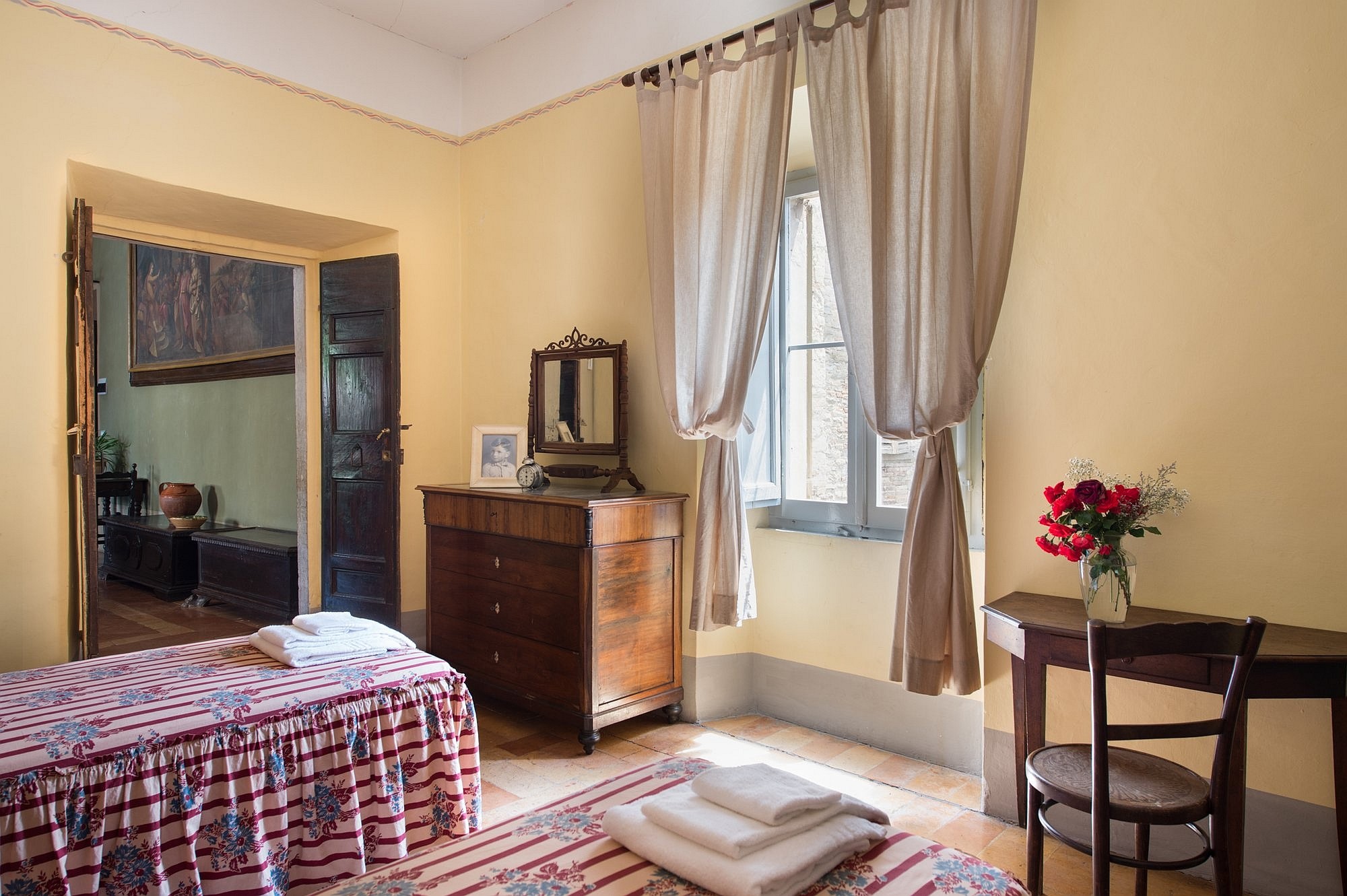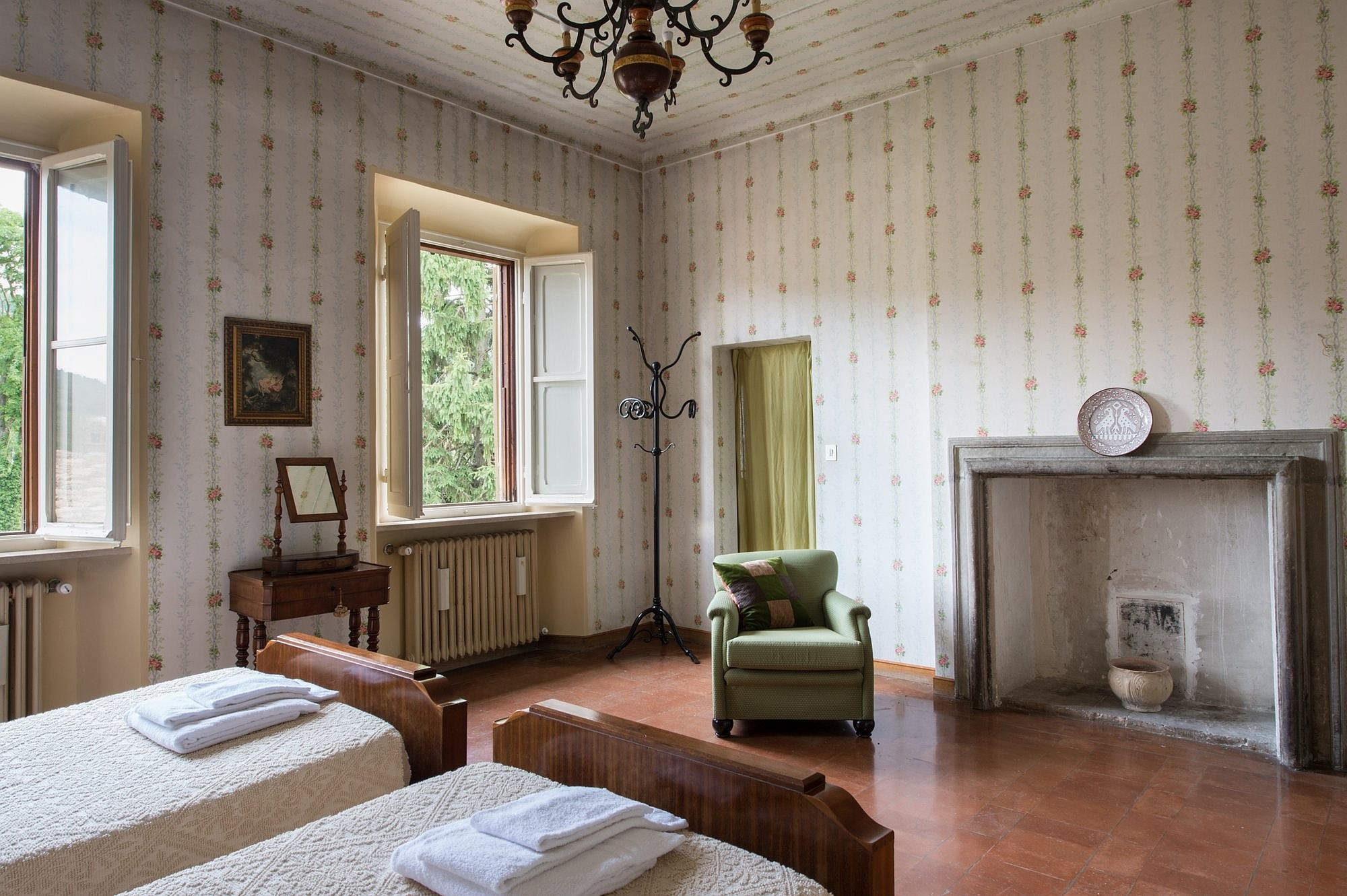 L’architettura del palazzo riflette le sue origini medievali e il suo splendore rinascimentale, con proporzioni armoniose e dettagli d’epoca perfettamente conservati. Esteso su circa 1.600 metri quadrati, il palazzo è suddiviso in due ali distinte, accessibili tramite una scalinata in pietra levigata dal tempo. L’ala sinistra ospita una splendida sala al piano nobile, decorata con affreschi rinascimentali originali e soffitti alti che raccontano cinque secoli di storia italiana. L’ala destra, invece, si sviluppa su due piani di spazi abitativi raffinati, dove il fascino storico si fonde con il comfort moderno, con porte ad arco, cornici ornate e ampie finestre che si affacciano sulla piazza e sui giardini privati.