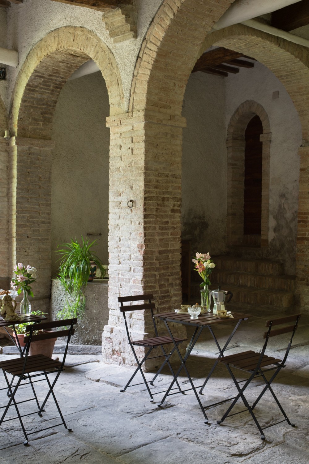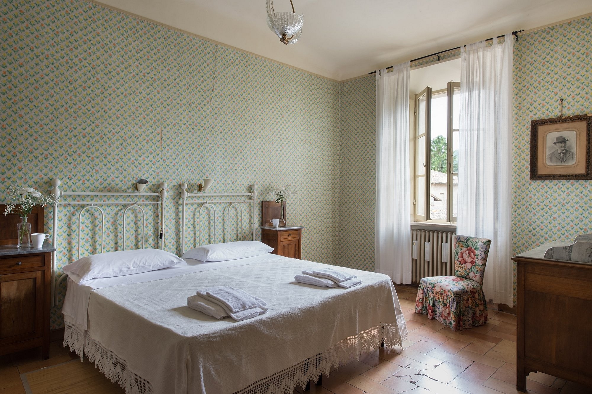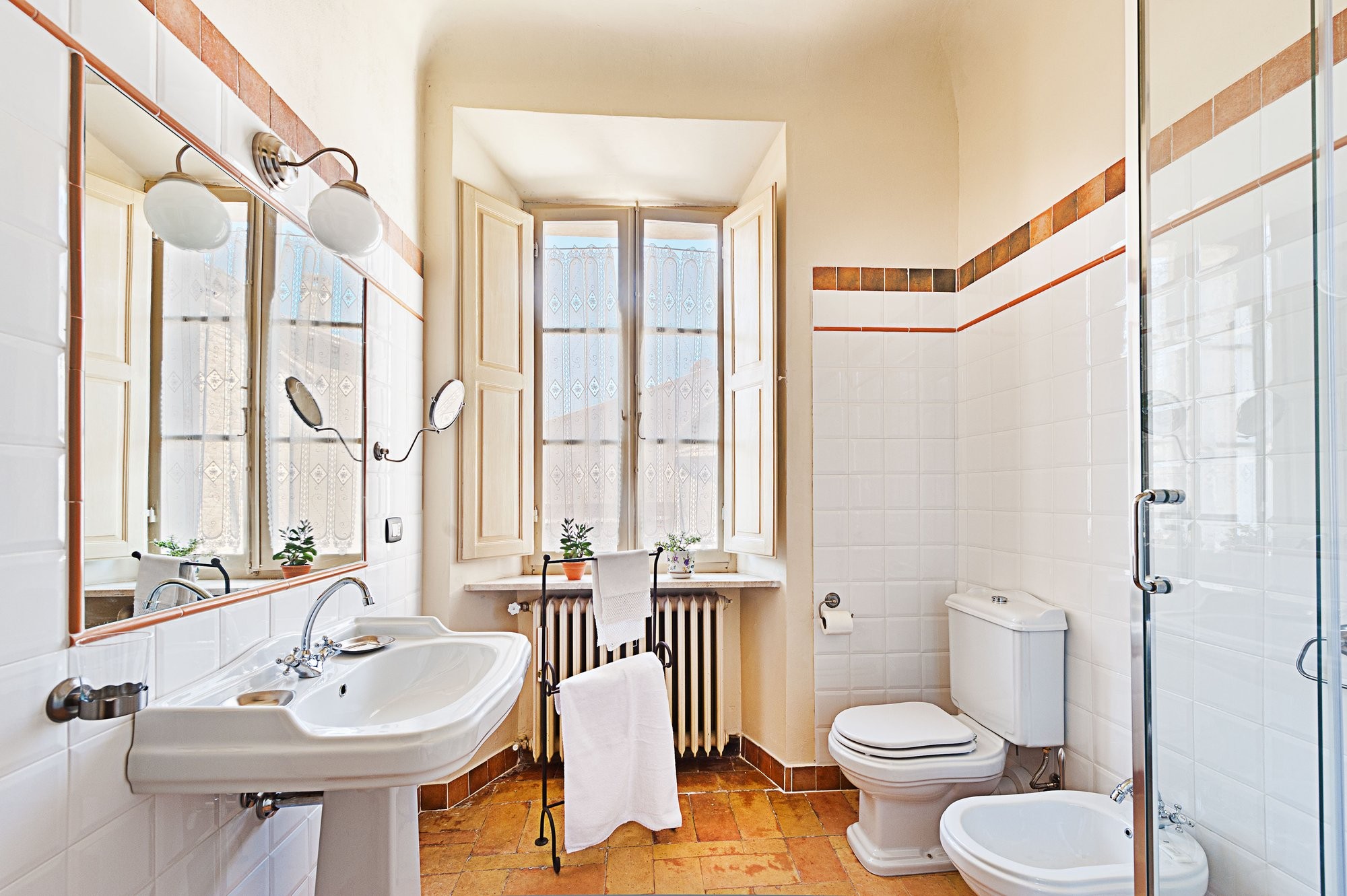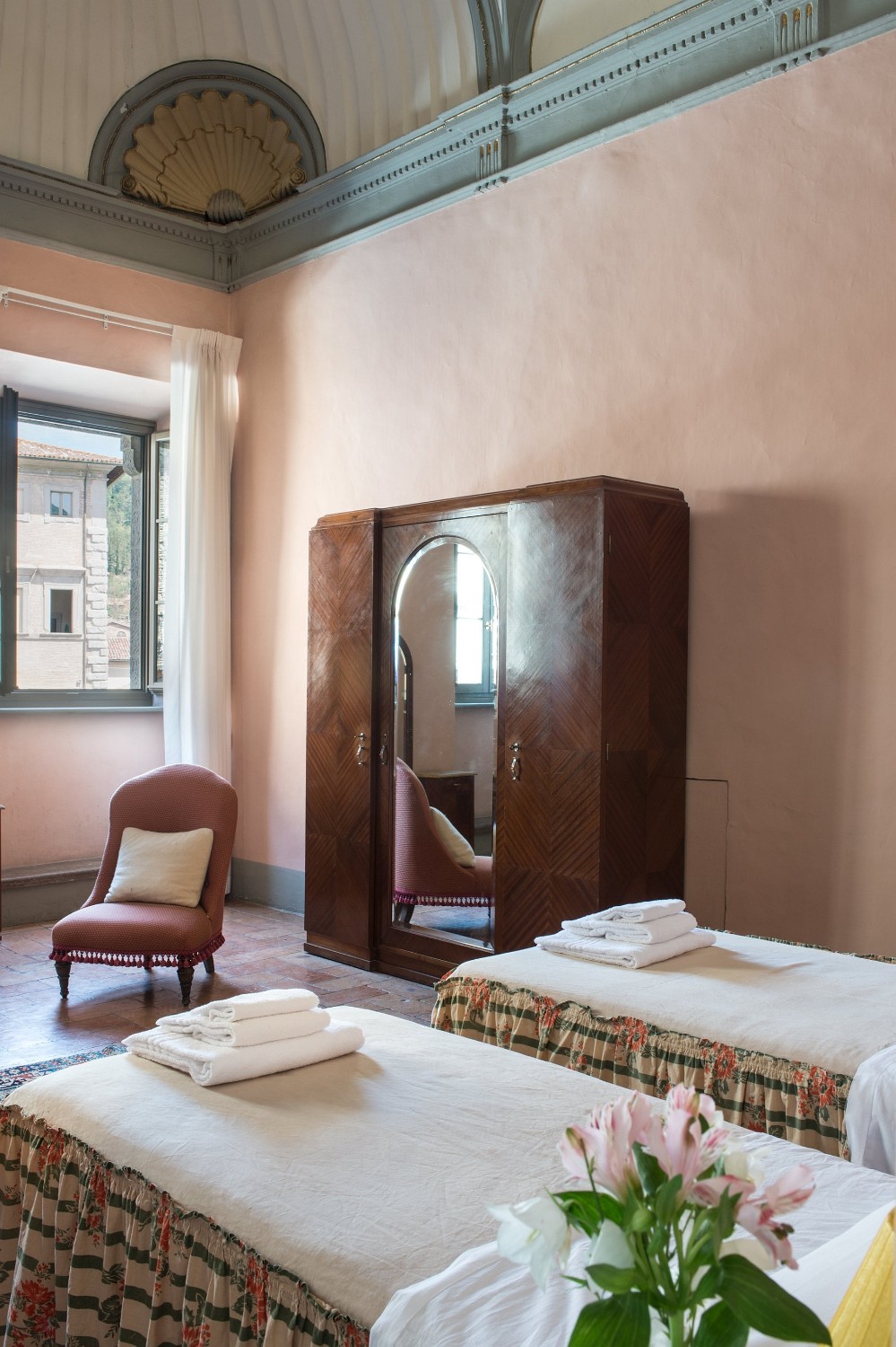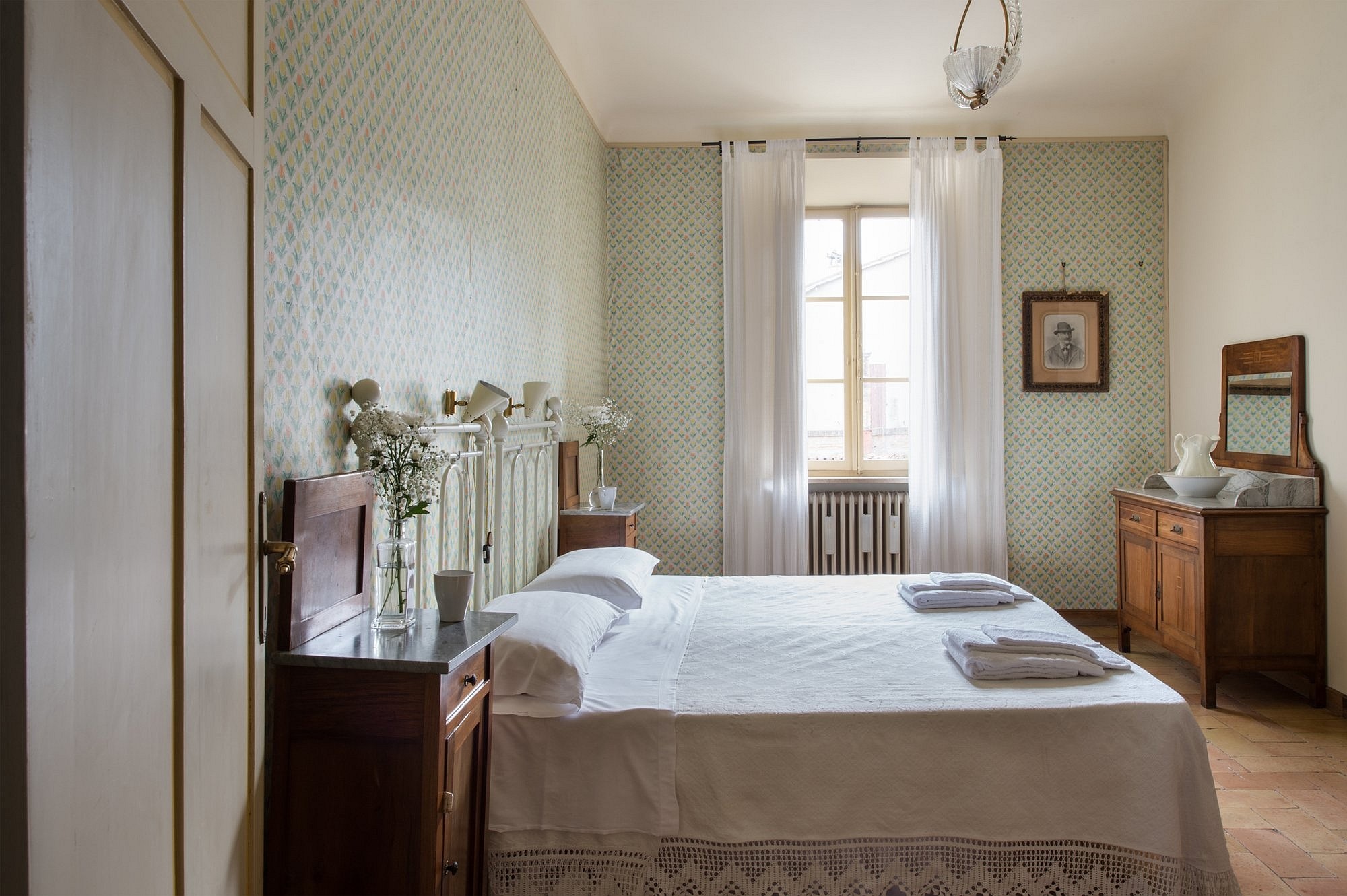 L’architettura del palazzo riflette le sue origini medievali e il suo splendore rinascimentale, con proporzioni armoniose e dettagli d’epoca perfettamente conservati. Esteso su circa 1.600 metri quadrati, il palazzo è suddiviso in due ali distinte, accessibili tramite una scalinata in pietra levigata dal tempo. L’ala sinistra ospita una splendida sala al piano nobile, decorata con affreschi rinascimentali originali e soffitti alti che raccontano cinque secoli di storia italiana. L’ala destra, invece, si sviluppa su due piani di spazi abitativi raffinati, dove il fascino storico si fonde con il comfort moderno, con porte ad arco, cornici ornate e ampie finestre che si affacciano sulla piazza e sui giardini privati.