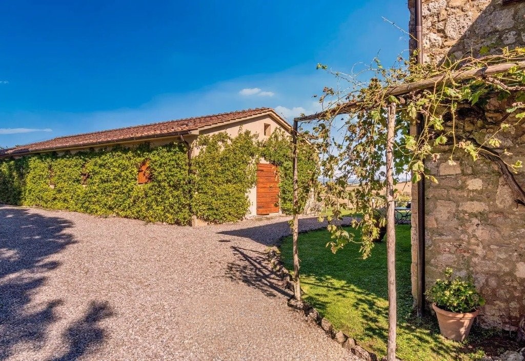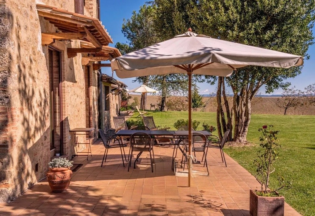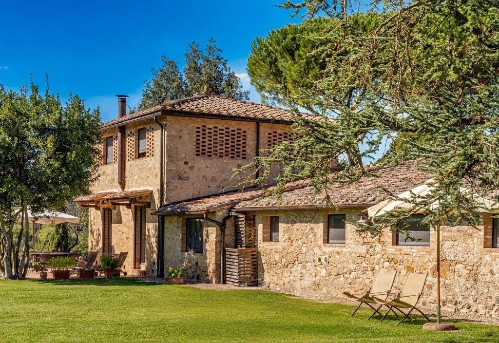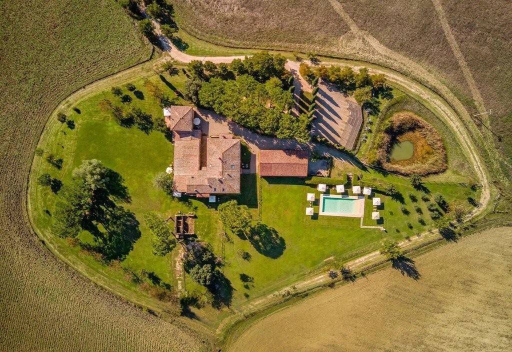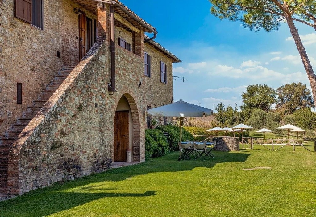 Ein restauriertes toskanisches Landhaus mit 760 m² Wohnfläche auf 1,5 Hektar Privatgrund, gelegen zwischen den Lehmhügeln der Crete Senesi und dem Val d'Orcia. Das Gebäude ist in sechs unabhängige Apartments unterteilt mit insgesamt dreizehn Schlafzimmern und neun Badezimmern. Große Fenster rahmen den freien Blick auf die umliegenden Hügel und Wälder.