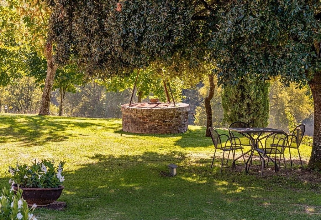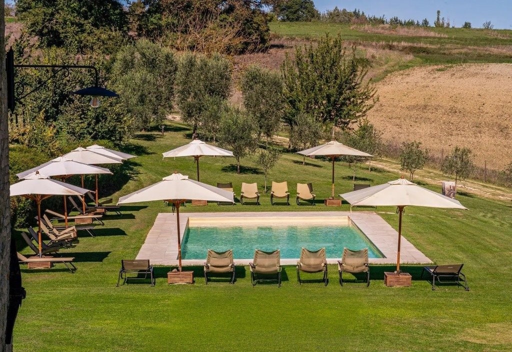 Im Außenbereich: gepflegter Garten mit altem Olivenbaumbestand, offene Freiflächen und ein Panoramapool mit Sonnenterrasse und freiem Blick auf die toskanische Landschaft.