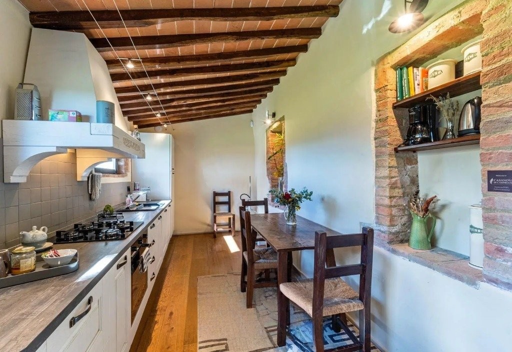 Die Restaurierung erfolgte in Anlehnung an die ursprüngliche ländliche Architektur. Die Innenräume behalten den Charakter des traditionellen toskanischen Bauernhauses: großzügige Proportionen, viel natürliches Licht, Raumaufteilung für familiäre Nutzung und Gästeunterbringung.