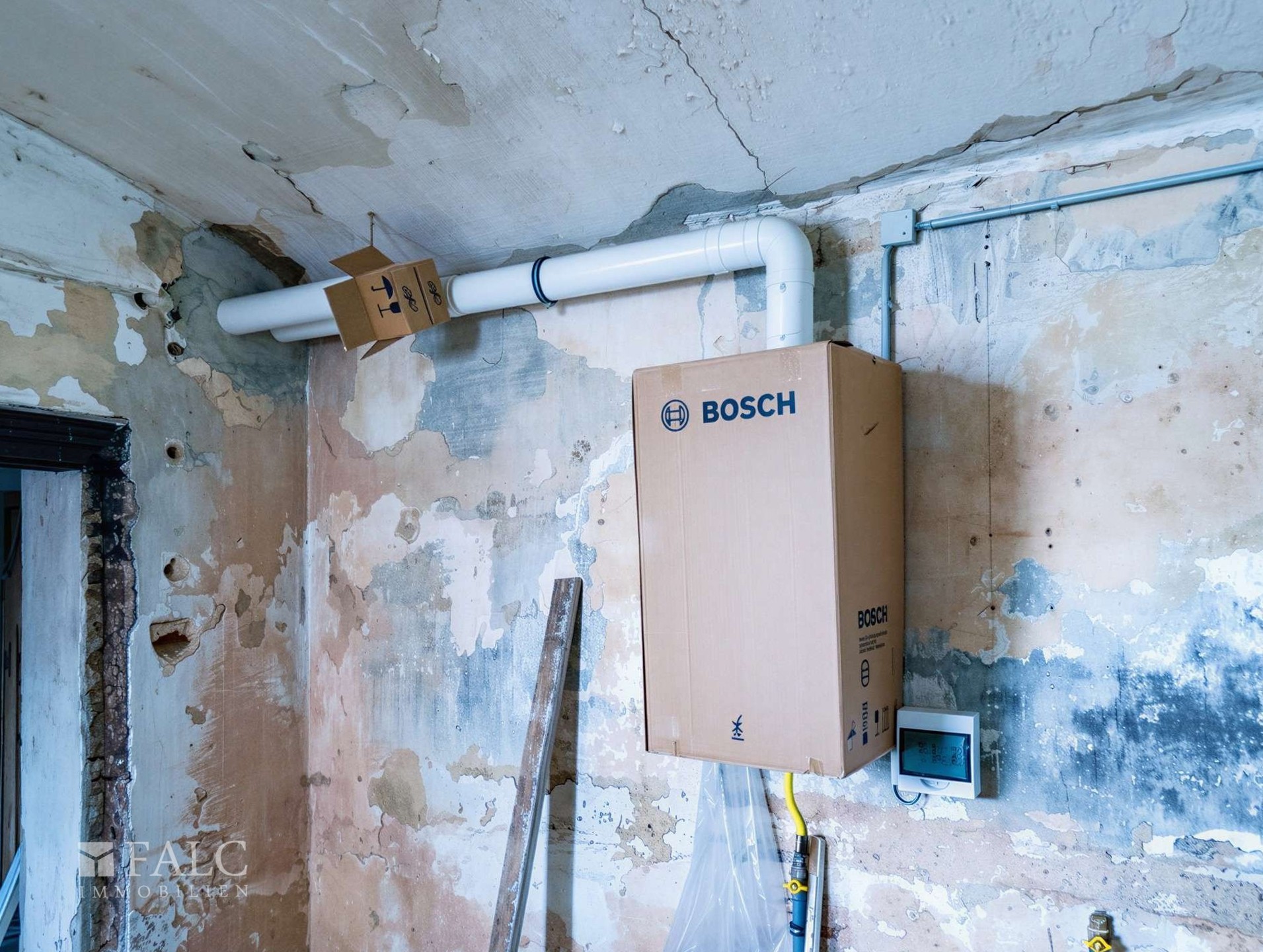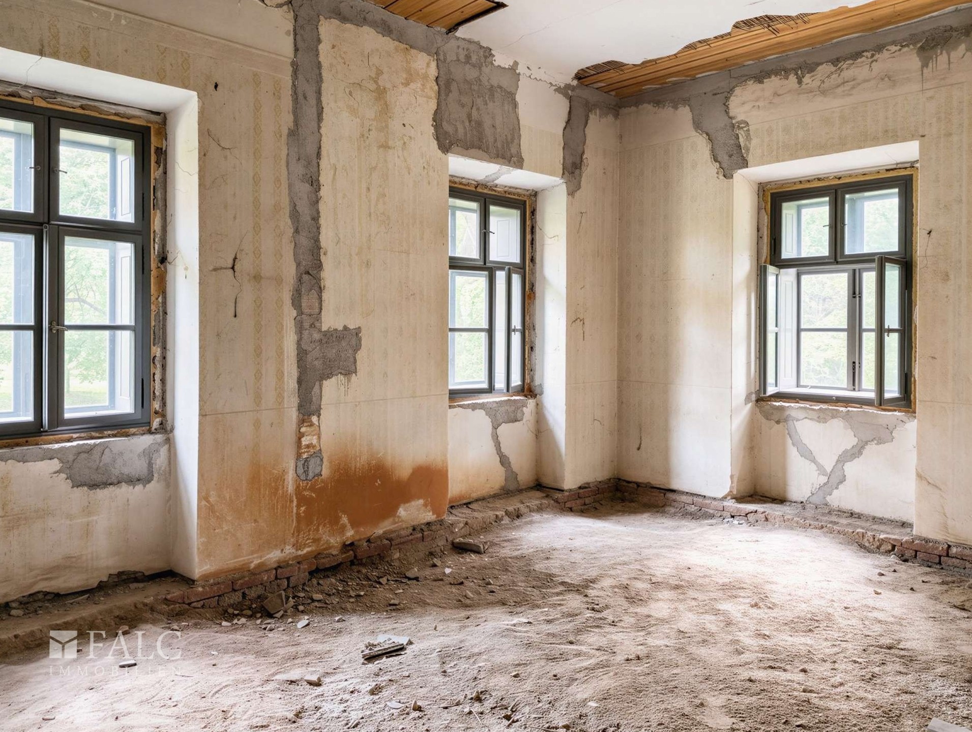 • Innenbereich: Sanierung hat begonnen; Bodenbeläge im Hauptgeschoss werden derzeit restauriert, ein modernes Gasheizsystem wird installiert.