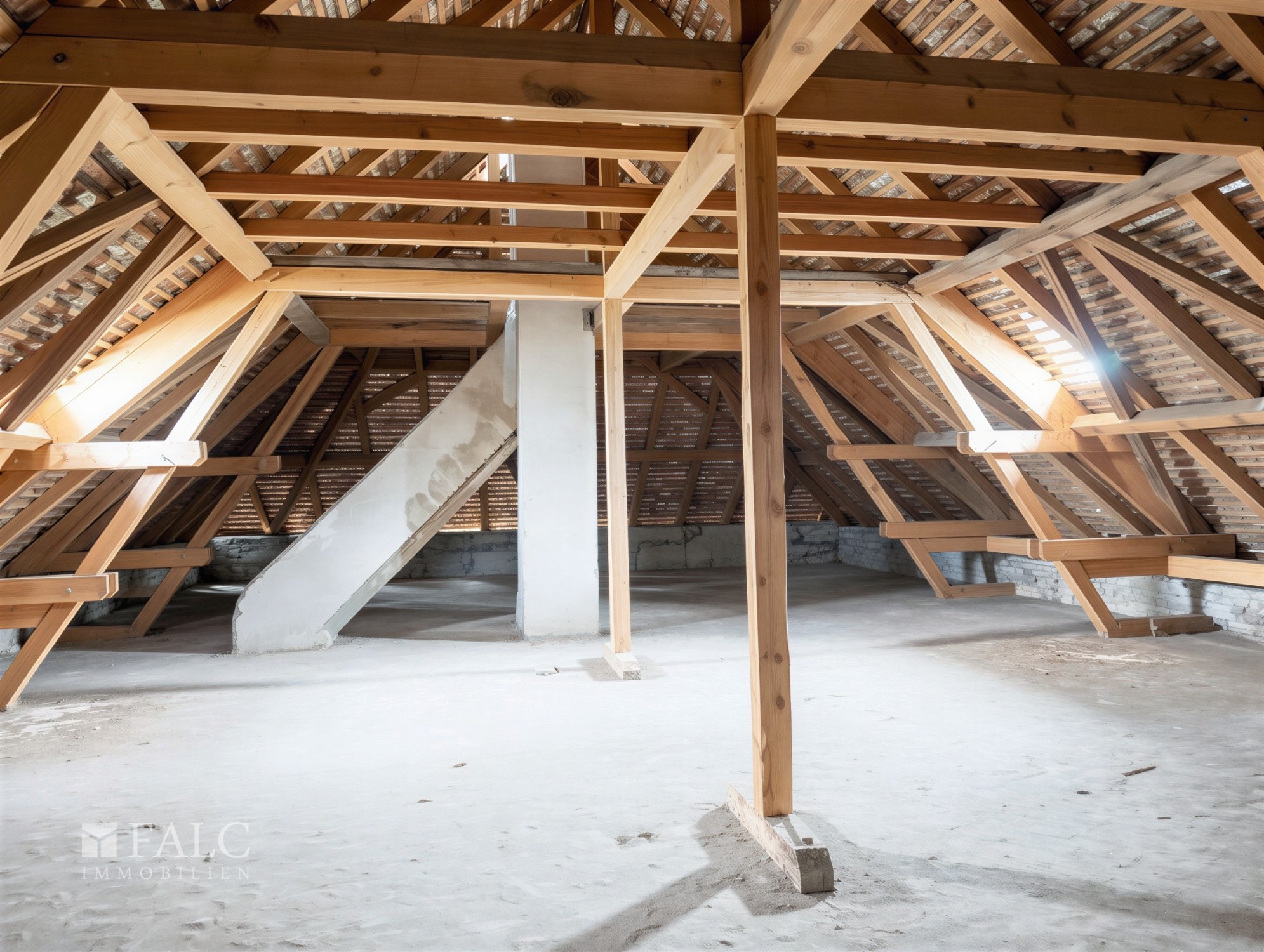• Flächen: Hauptgeschoss sowie ein ausbaubarer Dachboden (ca. 210 m²). Kellergeschoss für gastronomische Nutzung vorbereitet.