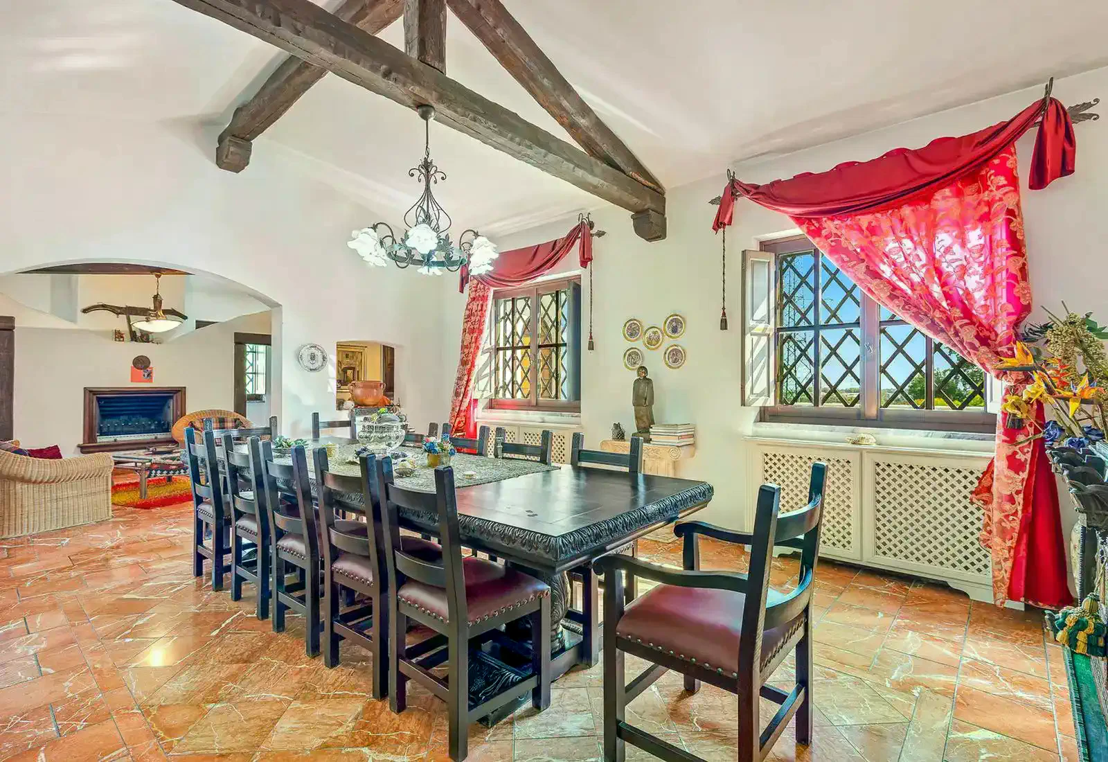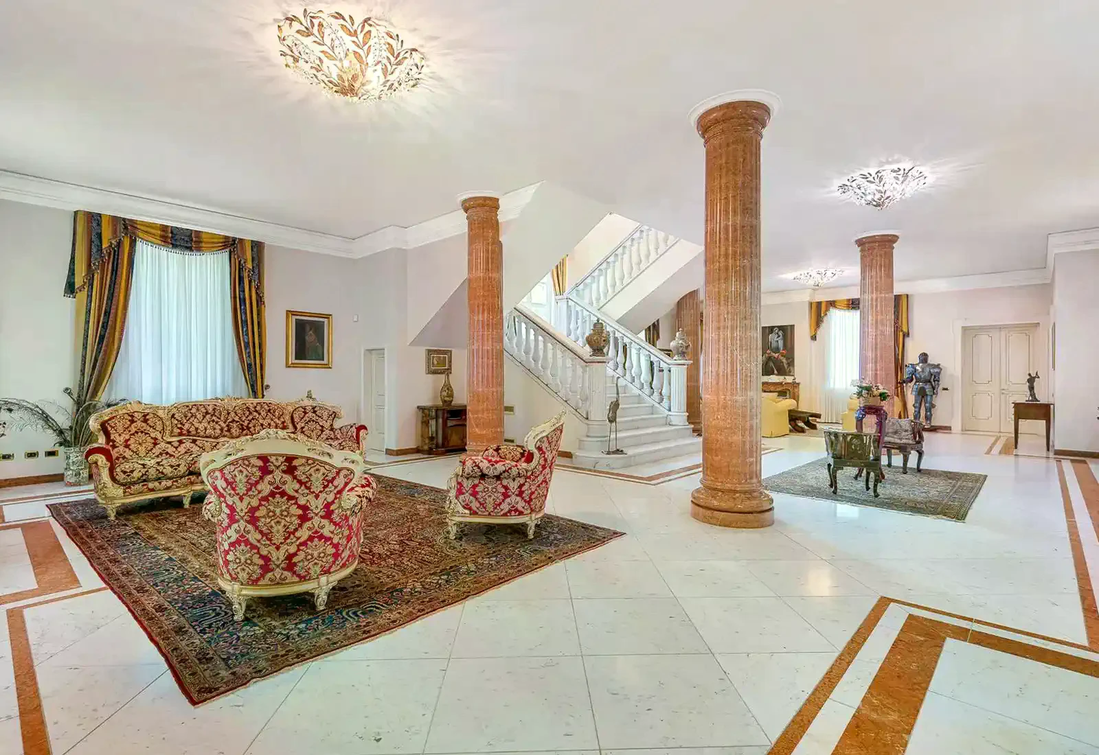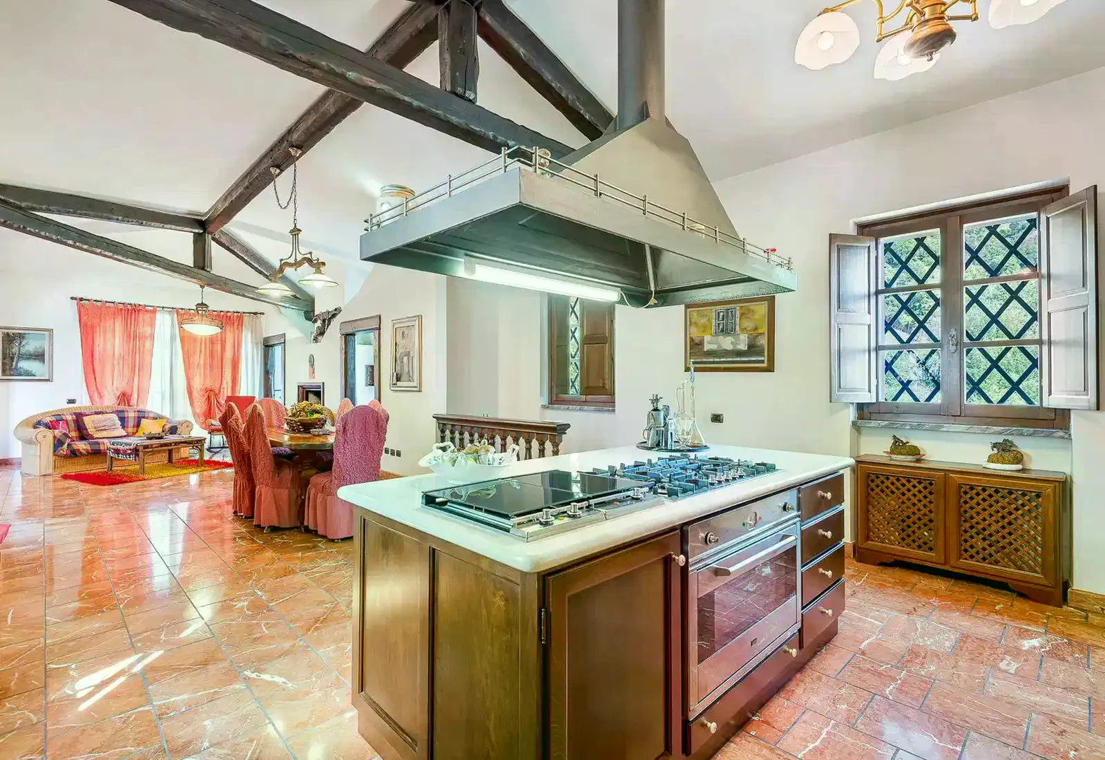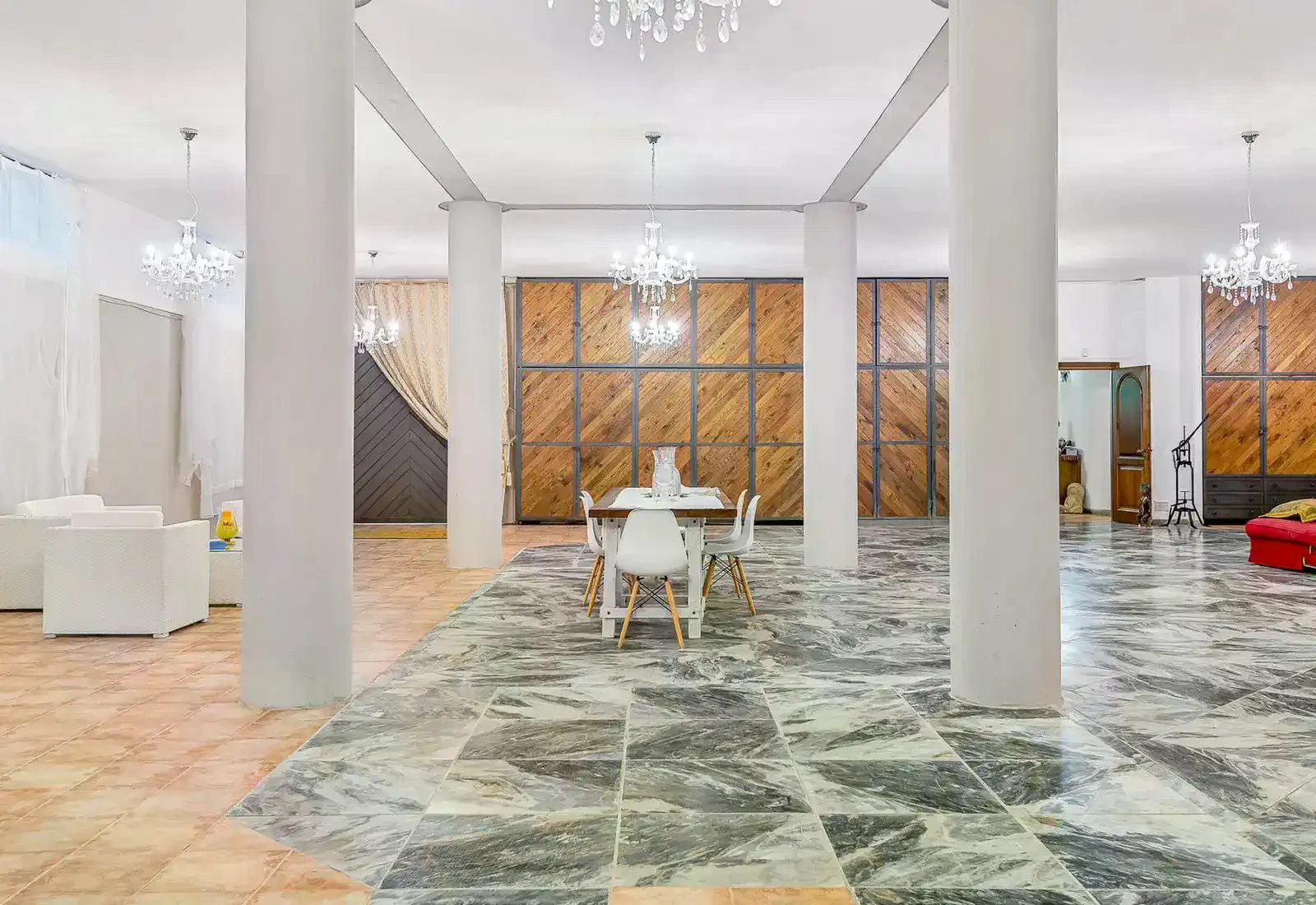 La villa segue una struttura storica su due livelli, restaurata integralmente con attenzione agli elementi architettonici originali e alla funzionalità contemporanea. L'atrio d'ingresso conduce a una sala di rappresentanza caratterizzata da un camino d'epoca. Una sala da pranzo adiacente si collega a due cucine completamente attrezzate: una concepita per pranzi conviviali e presentazioni culinarie, l'altra configurata per operazioni di catering professionale.