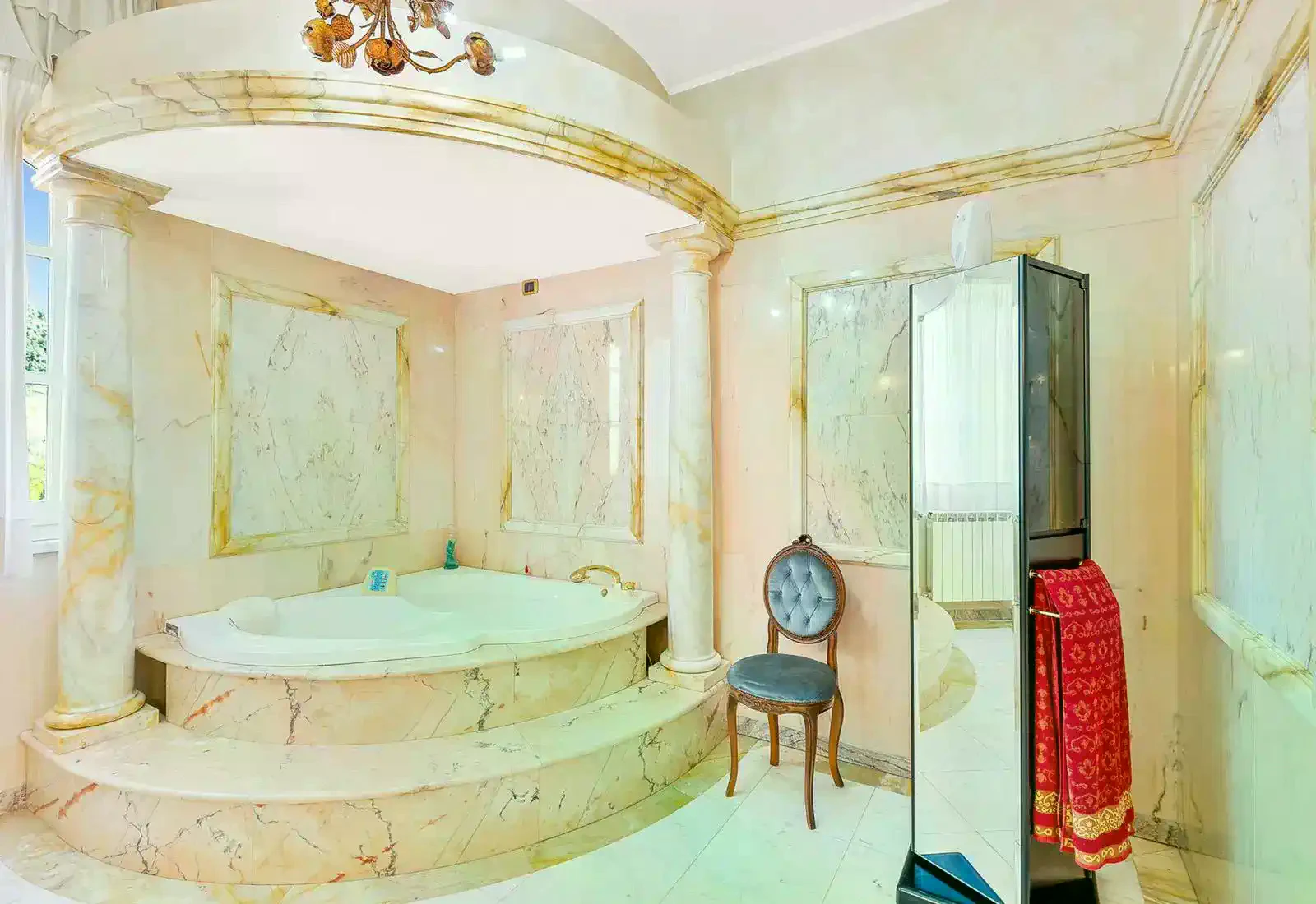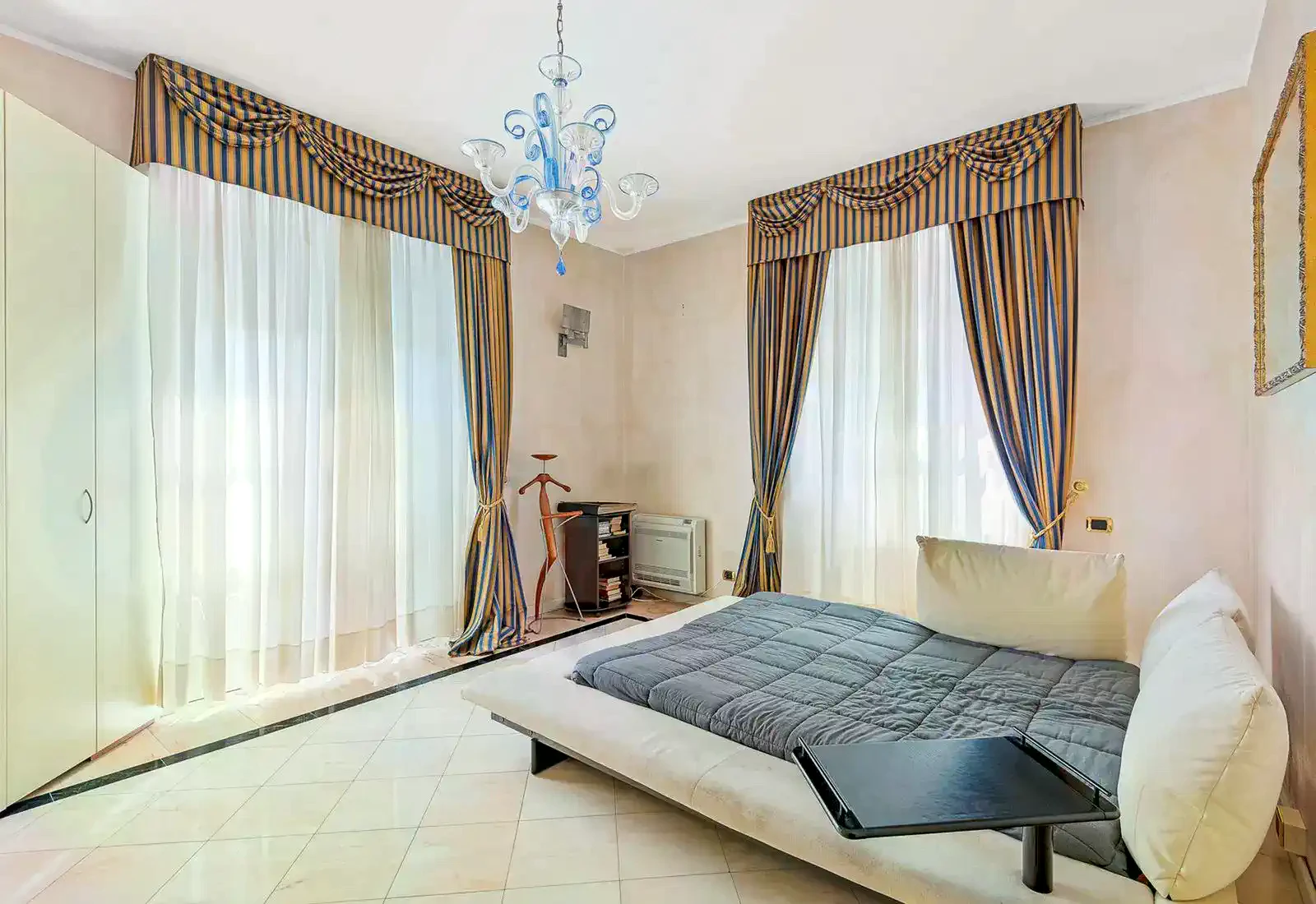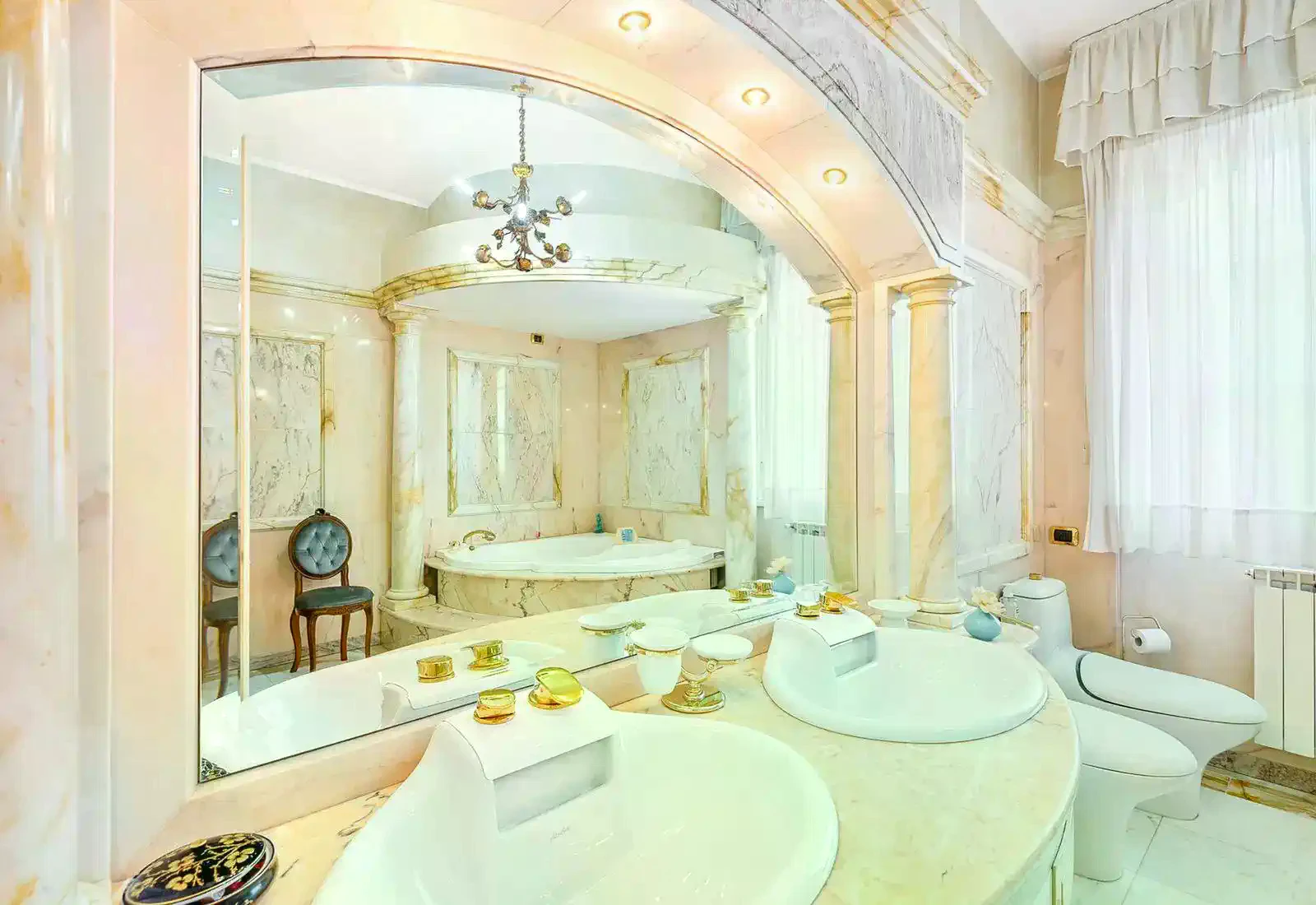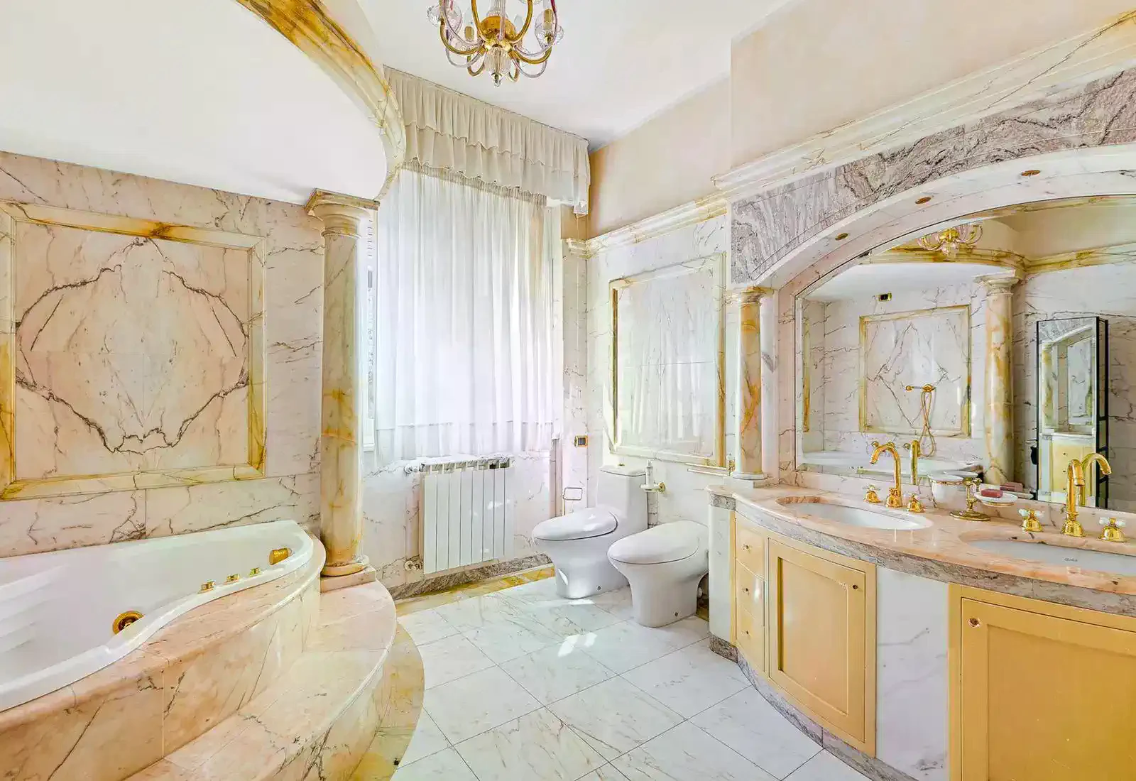 La zona notte comprende sei camere da letto e quattro bagni, rifiniti con marmi selezionati, boiserie su misura e dettagli artigianali che riflettono il patrimonio materiale della regione.