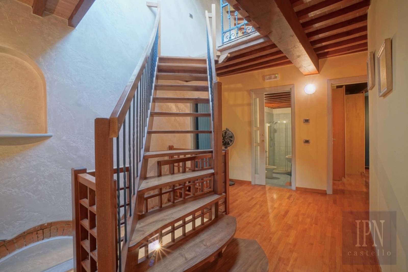 Una scala con dettagli originali in ferro battuto conduce all’ultimo piano, dove si trovano la lavanderia e il locale tecnico, oltre all’accesso a una terrazza privata di circa 10 m². La terrazza è attrezzata con barbecue e lavabo in marmo e offre vista sulle strade storiche e sul paesaggio circostante.