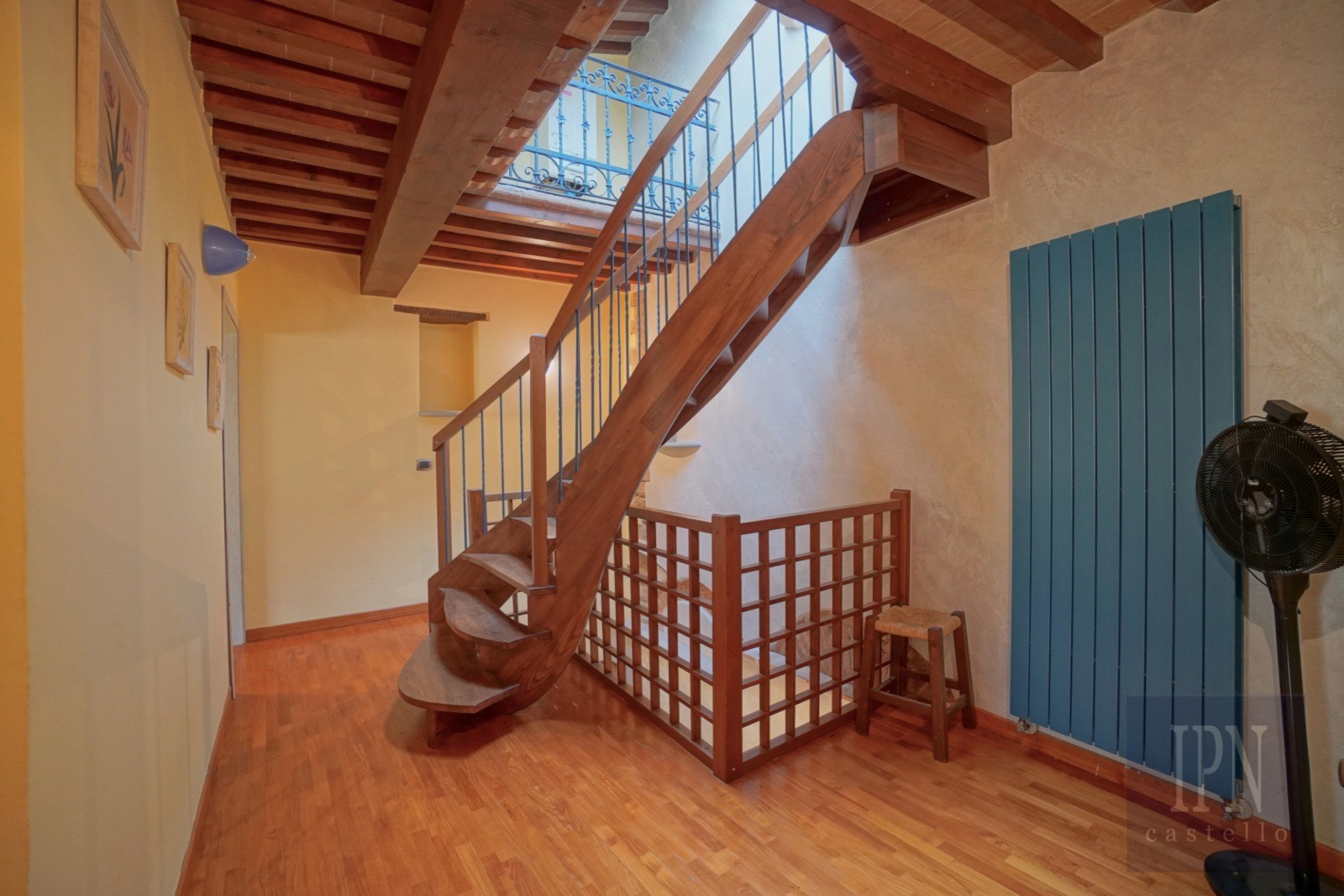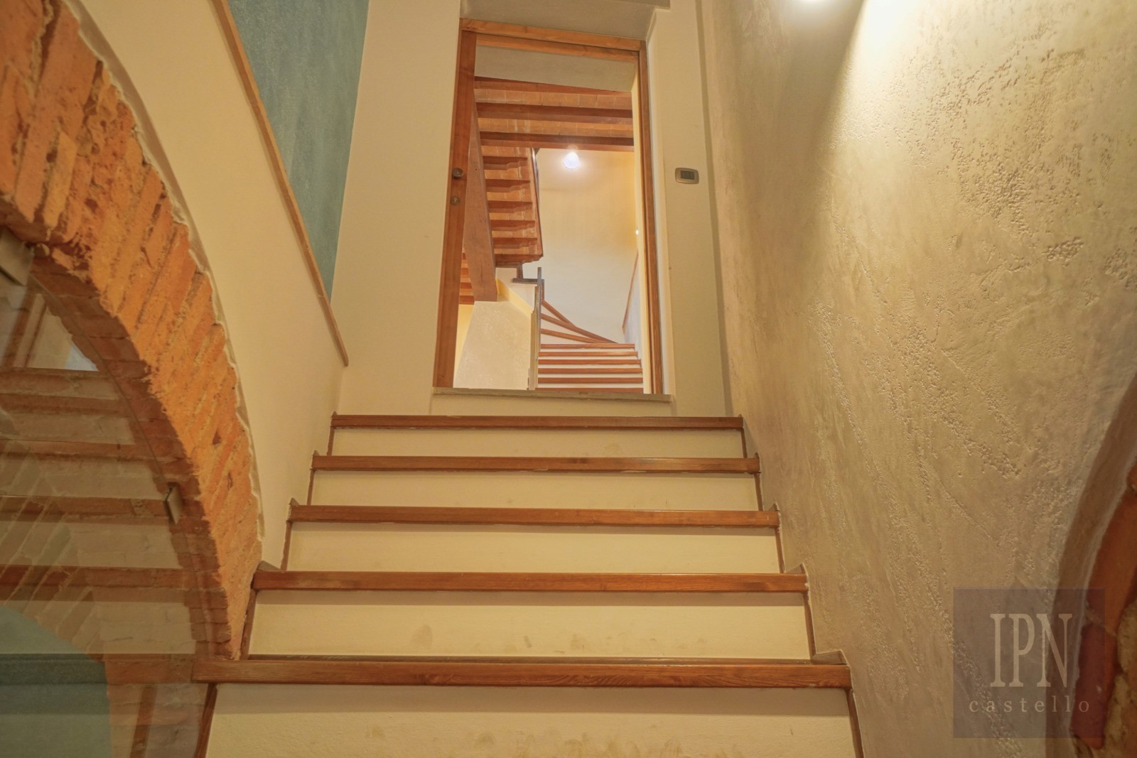 L’ingresso della casa è indipendente e si affaccia su una tipica viuzza del centro storico. All’interno, una scala in noce conduce al piano abitativo principale, dove si trova il soggiorno con camino semi-aperto. Su questo piano ci sono anche un bagno per gli ospiti e la cucina con accesso a un piccolo balcone che offre vista sui tetti del centro storico.