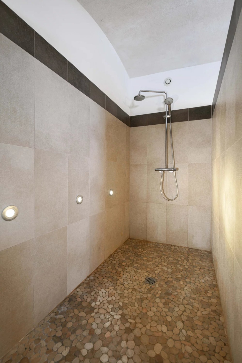 Al piano terra si trova una zona giorno con soggiorno e sala da pranzo a doppia altezza, aperta su un cortile alberato. Su questo livello sono presenti anche una camera da letto e un bagno con vasca, doccia a filo pavimento e lavabo. WC ospiti separato.