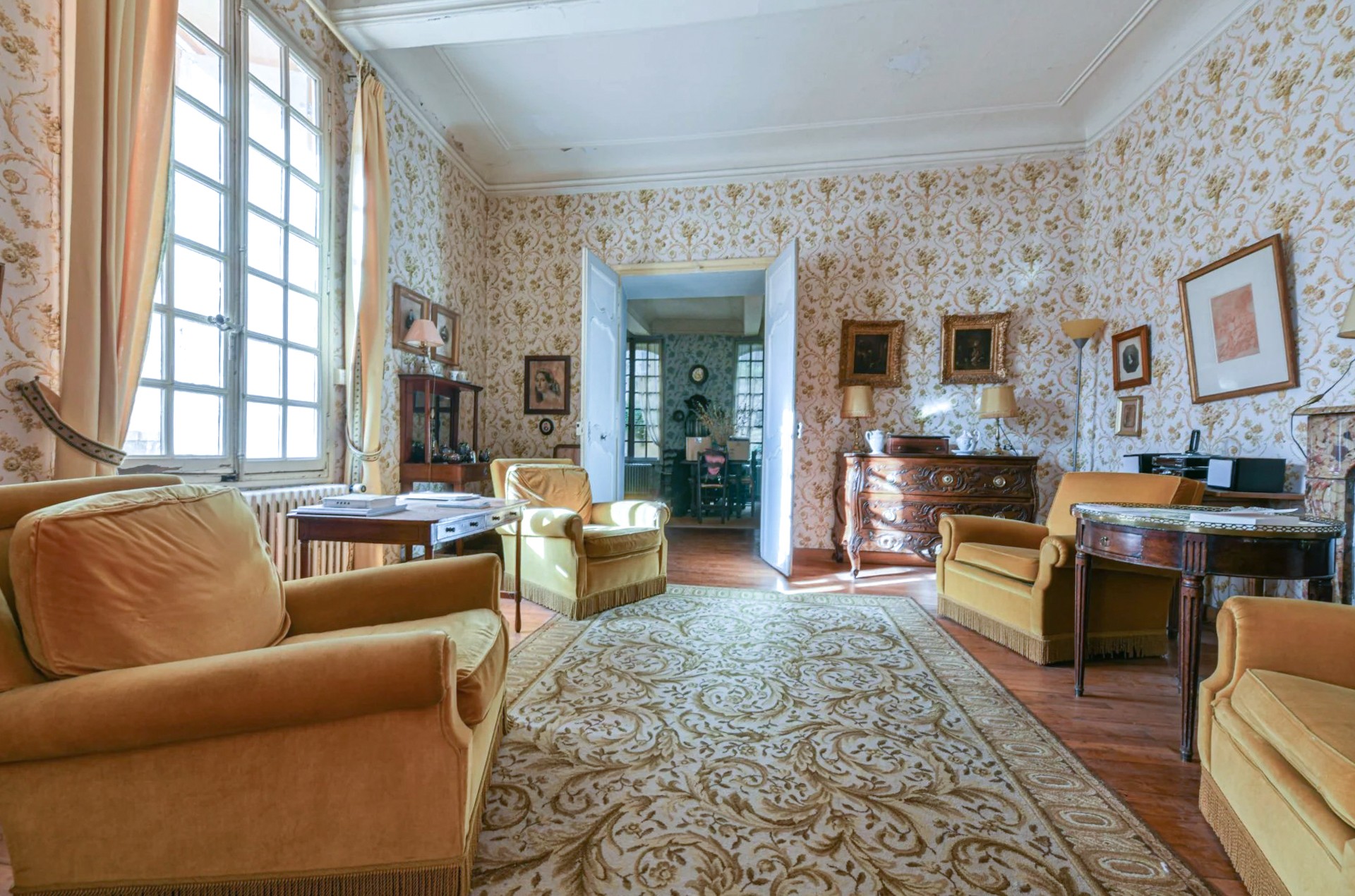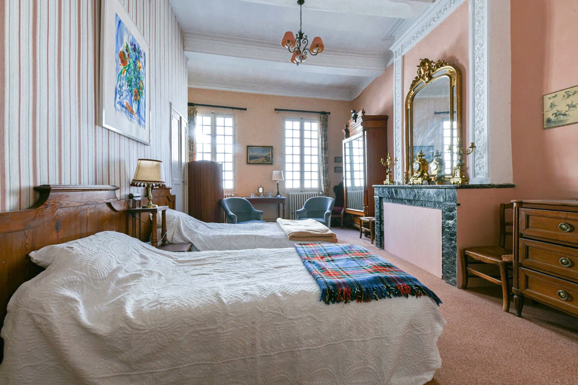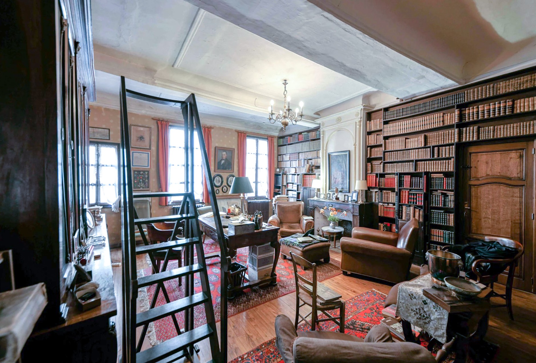 Il primo piano comprende biblioteca, sala da pranzo e cucina collegate tramite il pianerottolo della scala. Sul lato opposto si trovano un soggiorno con camino e due camere da letto (18 e 25 m²), ciascuna con bagno privato.