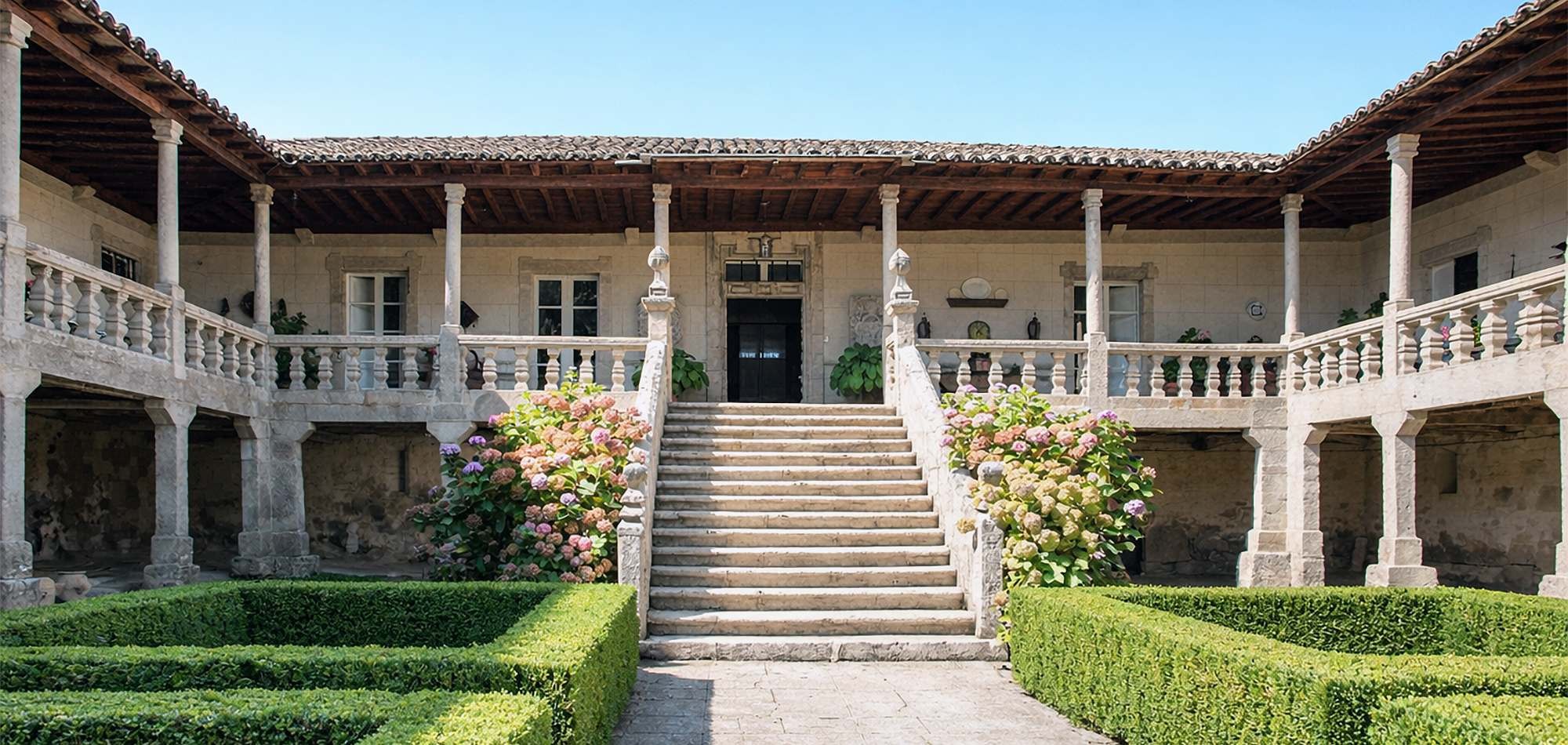 Zur funktionalen Architektur eines Pazo gehört auch der Hórreo. Dieser traditionelle galicische Kornspeicher aus Stein oder Holz ist auf Pfeilern aufgeständert, um die Ernte vor Feuchtigkeit und Nagetieren zu schützen. Seit Jahrhunderten prägt er das Bild der Landgüter und gilt heute als eines der charakteristischsten Architekturelemente Nordspaniens.